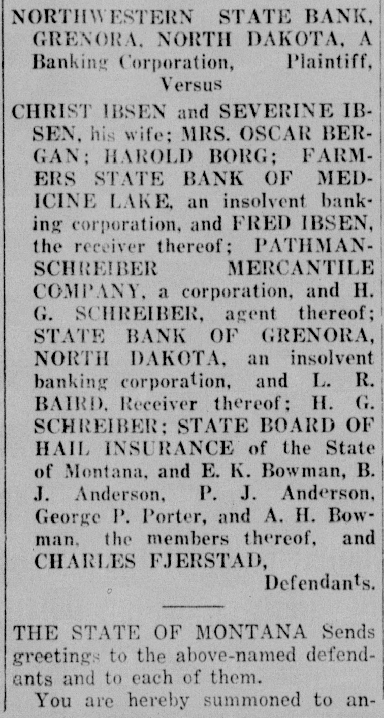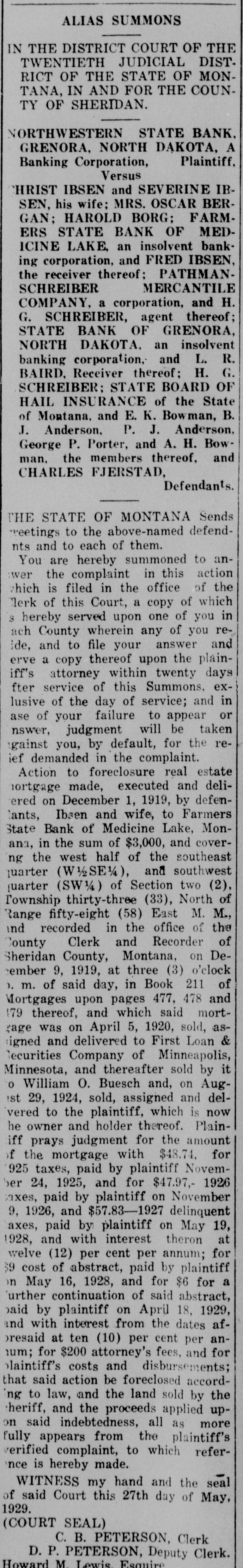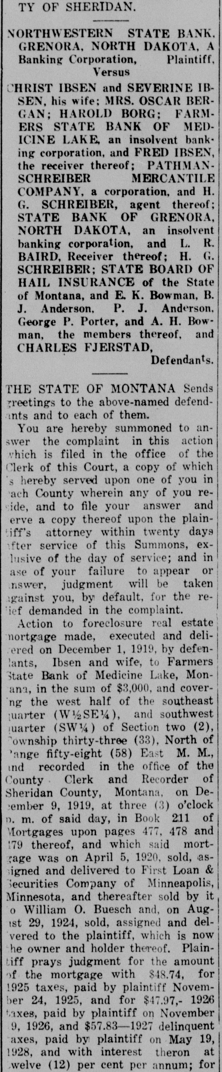 ALIAS SUMMONS IN THE DISTRICT COURT OF THE TWENTIETH JUDICIAL DISTRICT OF THE STATE OF MONTANA, IN AND FOR THE COUNTY OF SHERIDAN. NORTHWESTERN STATE BANK. GRENORA, NORTH DAKOTA, A Plaintiff, Banking Corporation, Versus HRIST IBSEN and SEVERINE IBSEN, his wife; MRS. OSCAR BERGAN; HAROLD BORG: FARMERS STATE BANK OF MEDICINE LAKE, an insolvent banking corporation, and FRED IBSEN, the receiver thereof; PATHMANMERCANTILE SCHREIBER COMPANY, a corporation, and H. G. SCHREIBER, agent thereof; STATE BANK OF GRENORA, NORTH DAKOTA. an insolvent banking corporation, and L. R. BAIRD, Receiver thereof; H. G. SCHREIBER; STATE BOARD OF HAIL INSURANCE of the State of Montana, and E. K. Bowman, B. J. Anderson, P. J. Anderson. George P. Porter, and A. H. Bowman. the members thereof, and CHARLES FJERSTAD, Defendants. THE STATE OF MONTANA Sends reetings to the above-named defendnts and to each of them. You are hereby summoned to anwer the complaint in this action which is filed in the office of the Clerk of this Court, a copy of which S hereby served upon one of you in ach County wherein any of you reide, and to file your answer and erve a copy thereof upon the plainiff's attorney within twenty days fter service of this Summons, exlusive of the day of service; and in ase of your failure to appear or nswer, judgment will be taken gainst you, by default, for the reief demanded in the complaint. Action to foreclosure real estate nortgage made, executed and deliered on December 1, 1919, by defenlants, Ibsen and wife, to Farmers State Bank of Medicine Lake, Monana, in the sum of $3,000, and coverng the west half of the southeast quarter (W½SE%), and southwest [uarter (SW1/4) of Section two (2), Township thirty-three (33), North of Range fifty-eight (58) East M. M., and recorded in the office of the County Clerk and Recorder of Sheridan County, Montana, on December 9, 1919, at three (3) o'clock ). m. of said day, in Book 211 of Mortgages upon pages 477, 478 and 179 thereof, and which said mortgage was on April 5, 1920, sold, assigned and delivered to First Loan & Securities Company of Minneapolis, Minnesota, and thereafter sold by it o William O. Buesch and, on Augist 29, 1924, sold, assigned and delvered to the plaintiff, which is now he owner and holder thereof. Plainiff prays judgment for the amount f the mortgage with $48.74, for 925 taxes, paid by plaintiff Novemper 24, 1925, and for $47.97,- 1926 taxes, paid by plaintiff on November 9, 1926, and $57.83-1927 delinquent axes, paid by plaintiff on May 19, 1928, and with interest theron at welve (12) per cent per annum; for $9 cost of abstract, paid by plaintiff on May 16, 1928, and for $6 for a "urther continuation of said abstract, baid by plaintiff on April 18, 1929, and with interest from the dates afpresaid at ten (10) per cent per annum; for $200 attorney's fees, and for blaintiff's costs and disbursements; that said action be foreclosed according to law, and the land sold by the heriff, and the proceeds applied up-