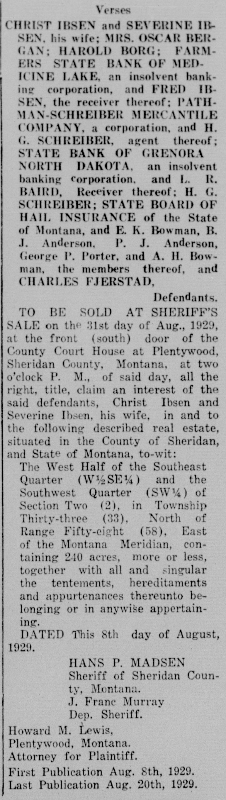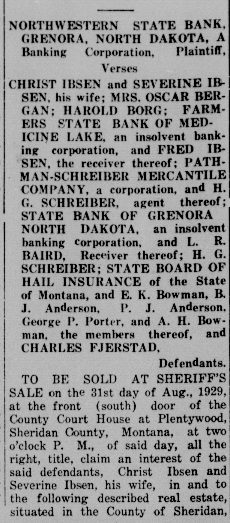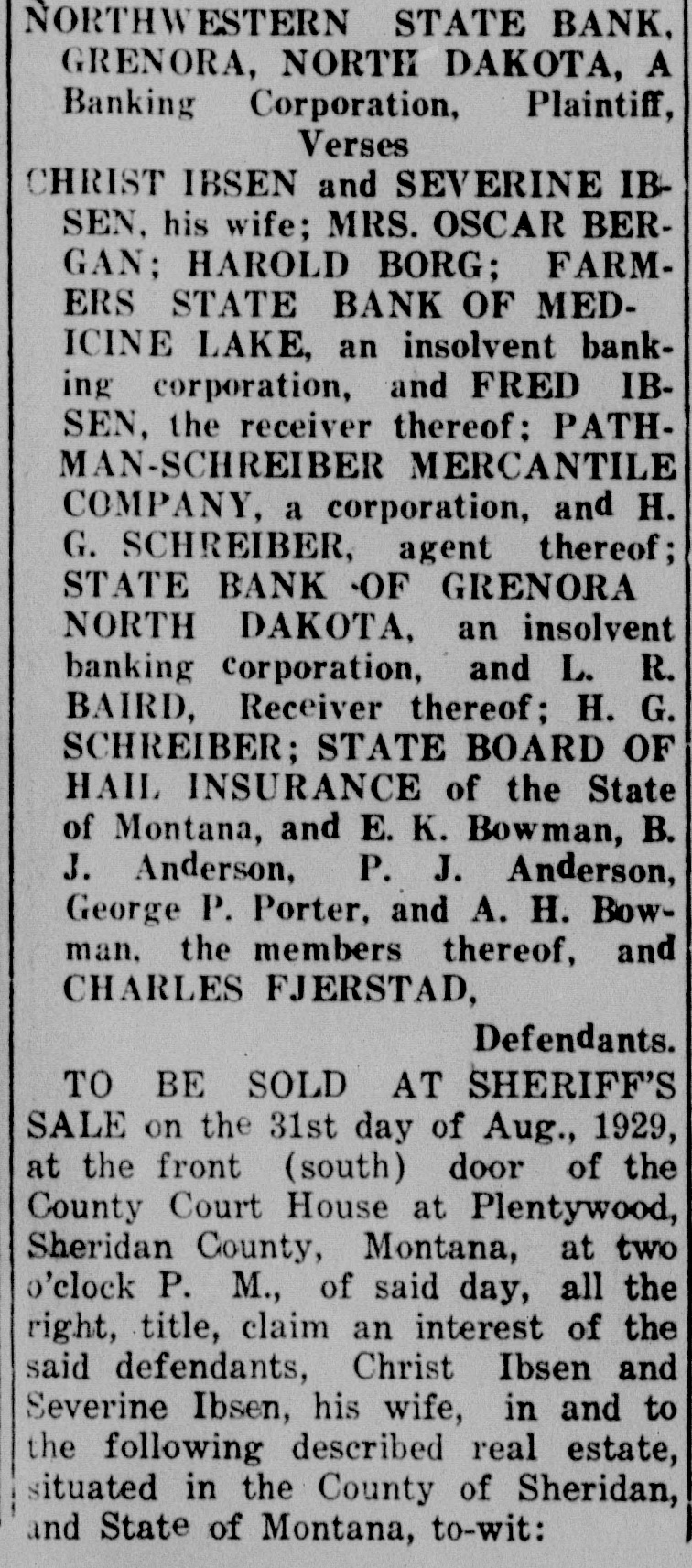 ALIAS SUMMONS IN THE DISTRICT COURT OF THE TWENTIETH JUDICIAL DISTRICT OF THE STATE OF MONTANA, IN AND FOR THE COUNTY OF SHERIDAN. NORTHWESTERN STATE BANK. GRENORA, NORTH DAKOTA, A Plaintiff, Banking Corporation, Versus HRIST IBSEN and SEVERINE IBSEN, his wife; MRS. OSCAR BERGAN; HAROLD BORG: FARMERS STATE BANK OF MEDICINE LAKE, an insolvent banking corporation, and FRED IBSEN, the receiver thereof; PATHMANMERCANTILE SCHREIBER COMPANY, a corporation, and H. G. SCHREIBER, agent thereof; STATE BANK OF GRENORA, NORTH DAKOTA. an insolvent banking corporation, and L. R. BAIRD, Receiver thereof; H. G. SCHREIBER; STATE BOARD OF HAIL INSURANCE of the State of Montana, and E. K. Bowman, B. J. Anderson, P. J. Anderson. George P. Porter, and A. H. Bowman. the members thereof, and CHARLES FJERSTAD, Defendants. THE STATE OF MONTANA Sends reetings to the above-named defendnts and to each of them. You are hereby summoned to anwer the complaint in this action which is filed in the office of the Clerk of this Court, a copy of which S hereby served upon one of you in ach County wherein any of you reide, and to file your answer and erve a copy thereof upon the plainiff's attorney within twenty days fter service of this Summons, exlusive of the day of service; and in ase of your failure to appear or nswer, judgment will be taken gainst you, by default, for the reief demanded in the complaint. Action to foreclosure real estate nortgage made, executed and deliered on December 1, 1919, by defenlants, Ibsen and wife, to Farmers State Bank of Medicine Lake, Monana, in the sum of $3,000, and coverng the west half of the southeast quarter (W½SE%), and southwest [uarter (SW1/4) of Section two (2), Township thirty-three (33), North of Range fifty-eight (58) East M. M., and recorded in the office of the County Clerk and Recorder of Sheridan County, Montana, on December 9, 1919, at three (3) o'clock ). m. of said day, in Book 211 of Mortgages upon pages 477, 478 and 179 thereof, and which said mortgage was on April 5, 1920, sold, assigned and delivered to First Loan & Securities Company of Minneapolis, Minnesota, and thereafter sold by it o William O. Buesch and, on Augist 29, 1924, sold, assigned and delvered to the plaintiff, which is now he owner and holder thereof. Plainiff prays judgment for the amount f the mortgage with $48.74, for 925 taxes, paid by plaintiff Novemper 24, 1925, and for $47.97,- 1926 taxes, paid by plaintiff on November 9, 1926, and $57.83-1927 delinquent axes, paid by plaintiff on May 19, 1928, and with interest theron at welve (12) per cent per annum; for $9 cost of abstract, paid by plaintiff on May 16, 1928, and for $6 for a "urther continuation of said abstract, baid by plaintiff on April 18, 1929, and with interest from the dates afpresaid at ten (10) per cent per annum; for $200 attorney's fees, and for blaintiff's costs and disbursements; that said action be foreclosed according to law, and the land sold by the heriff, and the proceeds applied up-