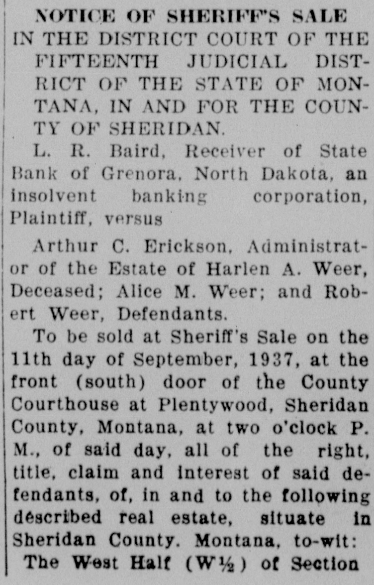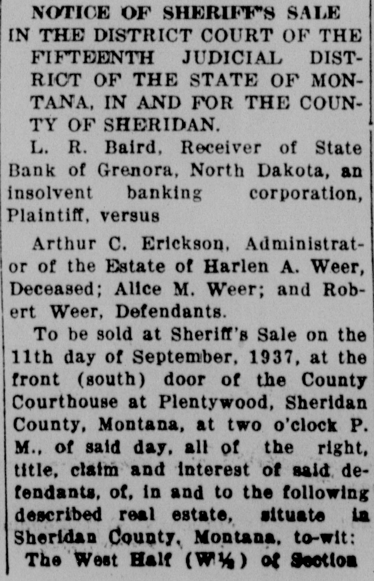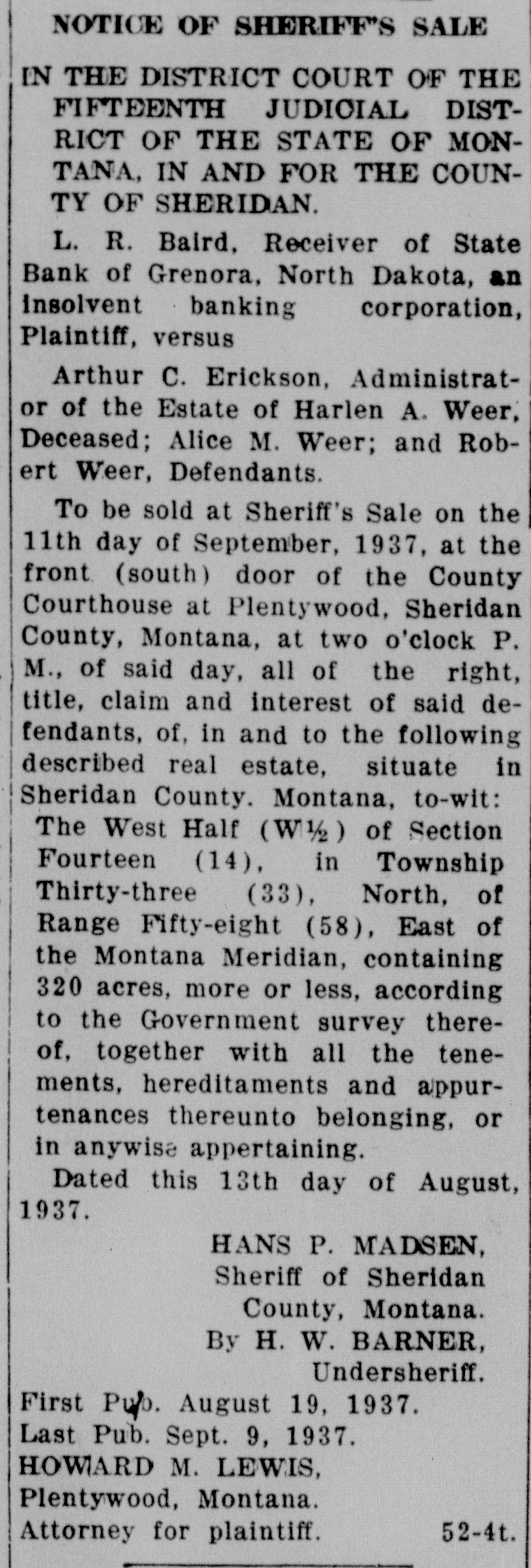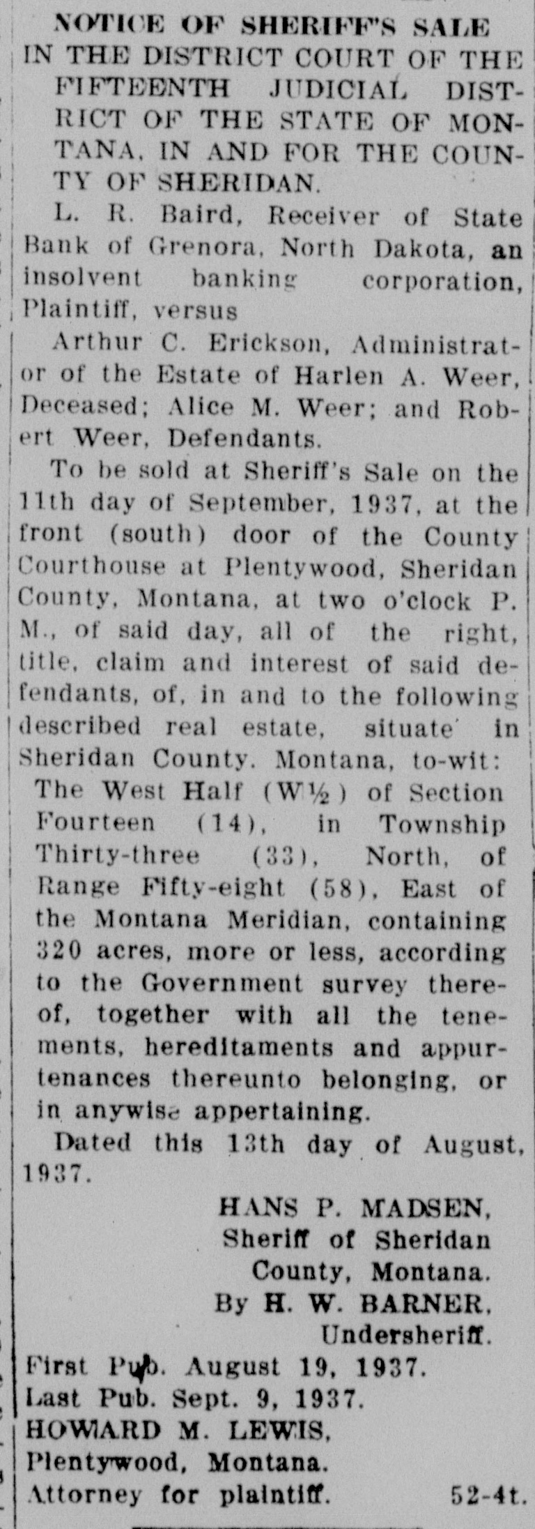 NOTICE OF SHERIFF'S SALE IN THE DISTRICT COURT OF THE FIFTEENTH JUDIOIAL DISTRICT OF THE STATE OF MONTANA, IN AND FOR THE COUNTY OF SHERIDAN. L. R. Baird, Receiver of State Bank of Grenora, North Dakota, an insolvent banking corporation, Plaintiff, versus Arthur C. Erickson, Administrator of the Estate of Harlen A. Weer, Deceased; Alice M. Weer; and Robert Weer, Defendants. To be sold at Sheriff's Sale on the 11th day of September, 1937, at the front (south) door of the County Courthouse at Plentywood, Sheridan County, Montana, at two o'clock P. M., of said day, all of the right, title, claim and interest of said defendants, of, in and to the following described real estate, situate in Sheridan County. Montana, to-wit: The West Half (W½) of Section Fourteen (14), in Township Thirty-three (33), North, of Range Fifty-eight (58), East of the Montana Meridian, containing 320 acres, more or less, according to the Government survey thereof, together with all the tenements, hereditaments and appurtenances thereunto belonging, or in anywise appertaining. Dated this 13th day of August, 1937. HANS P. MADSEN, Sheriff of Sheridan County, Montana. By H. W. BARNER, Undersheriff. First Pub. August 19, 1937. Last Pub. Sept. 9, 1937. HOWARD M. LEWIS, Plentywood, Montana. 52-4t. Attorney for plaintiff.