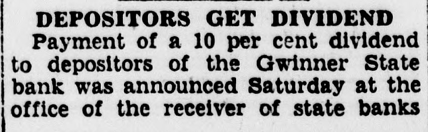 Article (Feb 6, 1932) reports the receiver of state banks announced payment of a 10% dividend to depositors of the Gwinner State Bank. That indicates the bank was in receivership (closed) and distributing assets; no run is mentioned in the available text.
