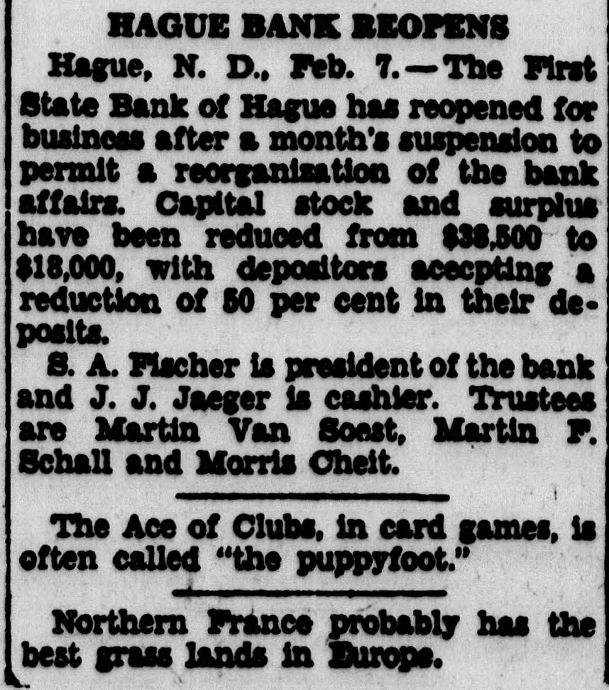 HAGUE BANK REOPENS Hague, N. D., Feb. 7.-The First State Bank of Hague has reopened for business after a month's suspension to permit a reorganization of the bank affairs. Capital stock and surplus have been reduced from $38,500 to $18,000, with depositors aceepting a reduction of 50 per cent in their deposits. S. A. Fischer is president of the bank and J. J. Jaeger is cashier. Trustees are Martin Van Soest, Martin F. Schall and Morris Cheit. The Ace of Clubs, in card games, is often called "the puppyfoot." Northern France probably has the best grass lands in Europe.
