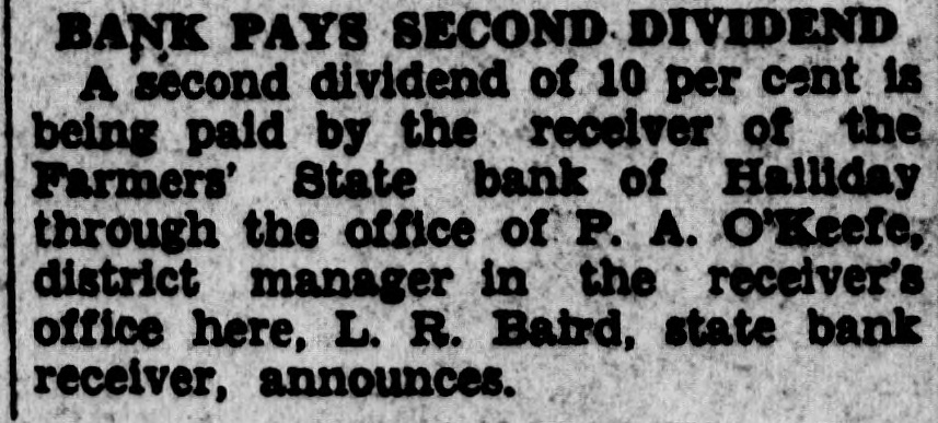 BANK PAYS SECOND DIVIDEND A second dividend of 10 per cent is being paid by the receiver of the Farmers' State bank of Halliday through the office of P. A. O'Keefe, district manager in the receiver's office here, L. R. Baird, state bank receiver, announces.