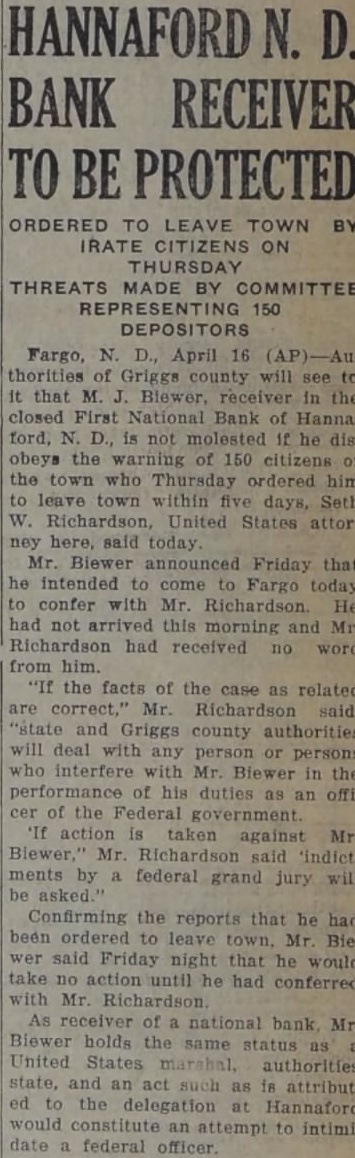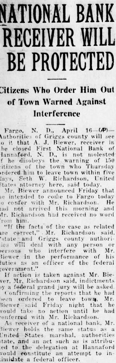 NATIONAL BANK RECEIVER WILL BE PROTECTED Citizens Who Order Him Out of Town Warned Against Interference Fargo, N. D., April 16-(P) Authorities of Griggs county will see to it that A. J. Biewer, receiver in the closed First National Bank of Hannaford, N. D., is not molested if he disobeys the warning of 150 citizens of the town who Thursday ordered him to leave town within five days, Seth W. Richardson, United States attorney here, said today. Mr. Biewer announced Friday that he intended to come to Fargo today to confer with Mr. Richardson. He had not arrived this morning and Mr. Richardson had received no word from him. "If the facts of the case as related are correct," Mr. Richardson said, "state and Griggs county authorities will deal with any person or persons who interfere with Mr. Biewer in the performance of his duties as an officer of the federal government." If action is taken against Mr. Biewer, Mr. Richardson said, indictments by a federal grand jury will be asked. Confirming the reports that he had been ordered to leave town, Mr. Biewer said Friday night that he would take no action until he had conferred with Mr. Richardson. As receiver of a national bank, Mr. Biewer holds the same status as a United States marshal, authorities state, and an act such as is attributed to the delegation at Hannaford would constitute an attempt to intimidate a federal officer.
