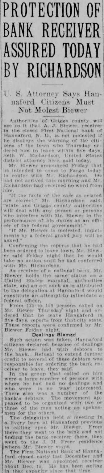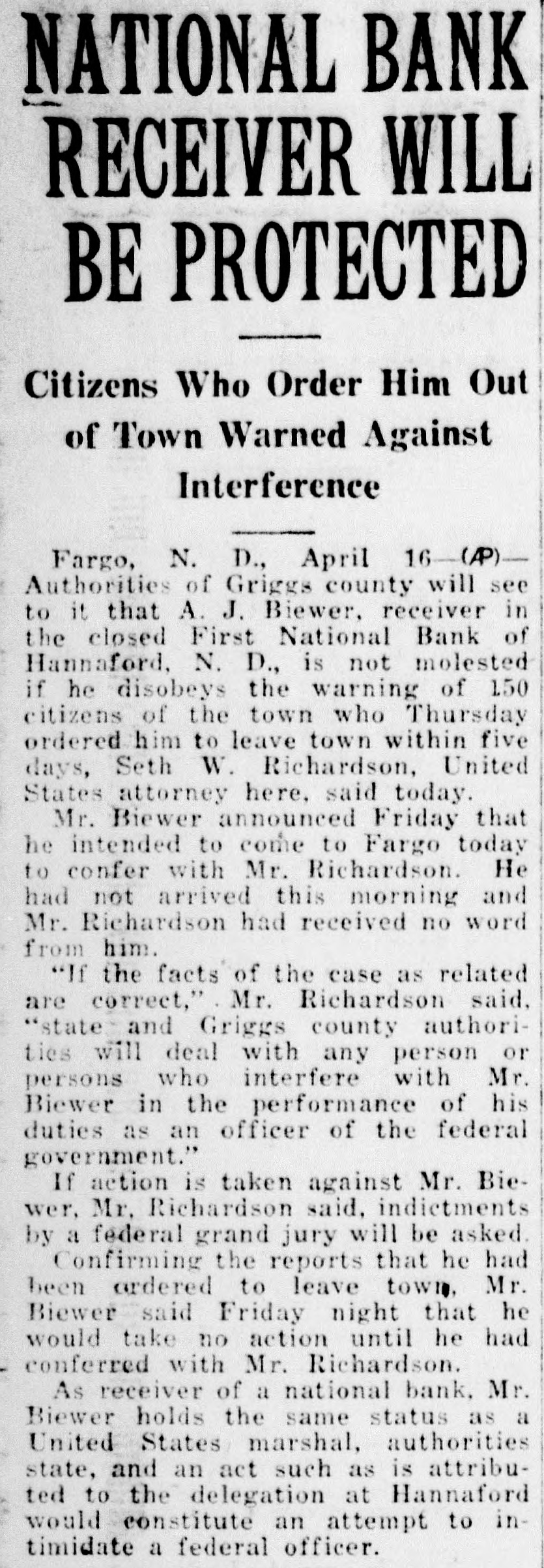 Fargo, N. D., April Authorities Griggs county will to that Biewer, receiver closed First National Bank N. molested he disobeys the warning of 150 citizens of the who Thursday ordered to town within five Seth W United attorney here. said today Biewer announced Friday that he intended come Fargo today confer with Mr. Richardson He not arrived this morning and Mr. Richardson had received no word him "If the facts of the case as related are correct,' Mr. Richardson said Griggs county will deal person persons interfere with Mr Biewer in the performance of his duties ns an officer of the federal If action taken against Mr. Bie Mr. Richardson said. by federal grand jury will be asked "onfirming the reports that he been ordered leave Mr. Biewer Friday night that would until he had conferred with Mr. Richardson. As receiver national bank. Mr. Biewer holds the same status United States marshal. state, and an such as attributed the delegation at Hannaford would constitute attempt to in timidate federal officer.