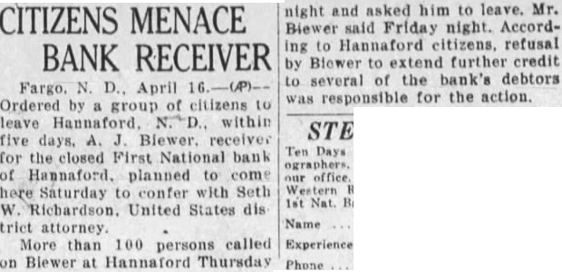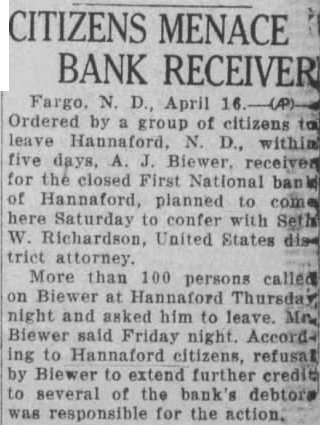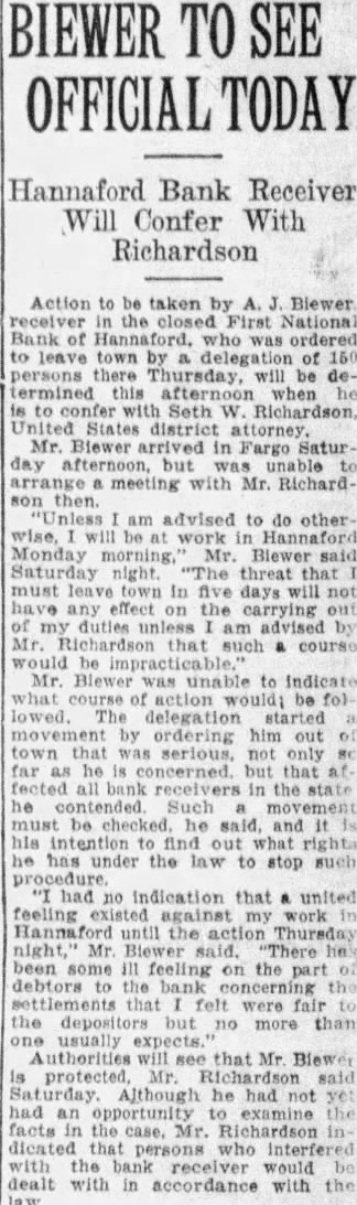 Action to be taken by J. Blewer receiver the closed First National Bank Hannaford. who was to leave town by of persons Thursday, will be determined this afternoon when he to confer with Seth W. Richardson, United States district attorney. Mr. Biewer arrived in Fargo Satur day but was unable arrange meeting with Mr. Richardson then. "Unless am advised to do other wise, work Hannaford Monday Blewer said Saturday "The threat that must leave town In five days will any effect on the carrying out of my duties unless advised Mr. such a course be Mr. Blewer was unable to Indicate what course action would; be fol lowed. The delegation started movement by ordering him out town that serious, not only far he concerned. but that all the he Such movement must be he said and his intention to find what rights he has under the law to stop such procedure had no indication that united feeling work Hannaford the action Thursday night,' Mr. "There been some 111 feeling on the part debtors the bank settlements that felt were fair the depositors but no more than usually Authorities will that Mr Biewer protected. Mr. said Although he had not had an examine facts in the case. Mr. Richardson dicated that persons who interfered with the receiver would be dealt with in accordance with the law.