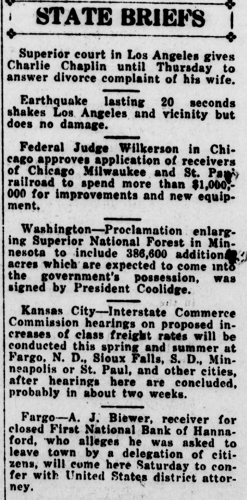STATE BRIEFS Superior court in Los Angeles gives Charlie Chaplin until Thursday to answer divorce complaint of his wife. Earthquake lasting 20 seconds shakes Los Angeles and vicinity but does no damage. Federal Judge Wilkerson in Chicago approves application of receivers of Chicago Milwaukee and St. Paul railroad to spend more than $1,000,000 for improvements and new equipment. Washington-Proclamation enlarging Superior National Forest in Minnesota to include 386,600 addition acres which are expected to come into the government's possession, was signed by President Coolidge. Kansas City-Interstate Commerce Commission hearings on proposed increases of class freight rates will be conducted this spring and summer at Fargo, N. D., Sioux Falls, S. D., Minneapolis or St. Paul, and other cities, after hearings here are concluded, probably in about two weeks. Fargo-A. J. Biewer, receiver for closed First National Bank of Hannaford, who alleges he was asked to leave town by a delegation of citizens, will come here Saturday to confer with United States district attorney.