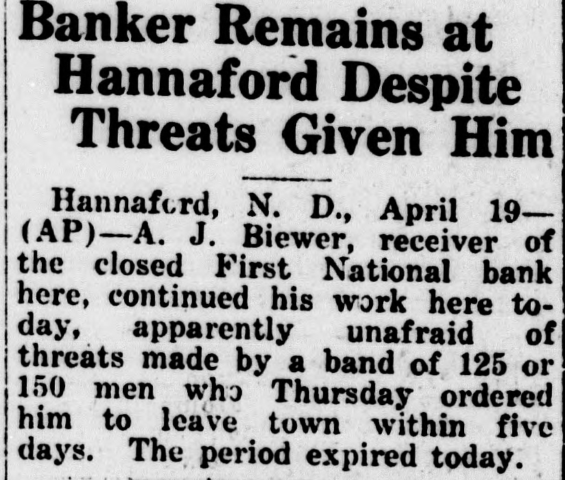 Banker Remains at Hannaford Despite Threats Given Him Hannaford, N. D., April 19(AP)-A. J. Biewer, receiver of the closed First National bank here, continued his work here today, apparently unafraid of threats made by a band of 125 or 150 men who Thursday ordered him to leave town within five days. The period expired today.