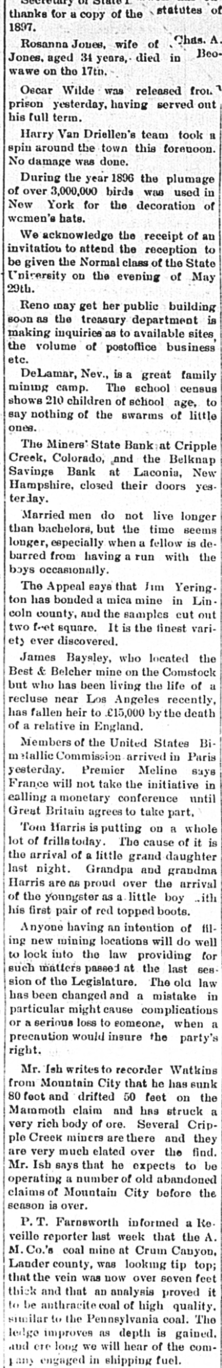 statutes of thanks for a copy of the 1897. Chas. A Rosanna Jones, wife of BeoJones, aged 34 years, died in wawe on the 17th. Oscar Wilde was released from 7 prison yesterday, having served out his full term. Harry Van Driellen's team took H spin around the town this forenoon. No damage was done. During the year 1896 the plumage of over 3,000,000 birds was used in New York for the decoration of women's hats. We acknowledge the receipt of an invitation to attend the reception to be given the Normal class of the State University on the evening of May 29th. Reno may get her public building soon as the treasury department is making inquiries as to available sites the volume of postoffice business etc. DeLamar, Nev., is a great family mining camp. The school census shows 210 children of school age, to say nothing of the swarms of little ones. The Miners' State Bank at Cripple Creek, Colorado, and the Belknap Savings Bank at Laconia, New Hampshire, closed their doors yes. terday. Married men do not live longer than bachelors, but the time seems longer, especially when a fellow is debarred from having a run with the boys occasionally. The Appeal eays that Jim Yerington has bonded a mica mine in Lincoln county, and the samples cut out two feet square. It is the finest variets ever discovered. James Baysley, who located the Best & Belcher mine on the Comstock but who has been living the life of a recluse near Los Angeles recently, has fallen heir to £15,000 by the death of a relative in England. Members of the United States Bim etallic Commission arrived in Paris yesterday. Premier Meline says France will not take the initiative in ealling a monetary conference until Great Britain agrees to take part, Tom Harris is putting on a whole lot of frillatoday. The cause of it is the arrival of a little grand daughter last night. Grandpa and grandma Harris are as proud over the arrival of the youngster as a little boy with his first pair of red topped boots. Anyone having an intention of filing new mining locations will do well to look into the law providing for such matters passed at the last ses. sion of the Legislature. The old law has been changed and a mistake in particular might cause complications or a serious loss to someone, when a precaution would insure the party's right. Mr. Ish writes to recorder Watkins from Mountain City that he has sunk 80 feet and drifted 50 feet on the Mammoth claim and has struck a very rich body of ore. Several Cripple Creek miners are there and they are very much elated over the find. Mr. Ish says that he expects to be operating a number of old abandoned claims of Mountain City before the season is over. P.T. Farnsworth informed a Re. veille reporter last week that the A. M. Co.'s coal mine at Crum Canyon, Lander county, was looking tip top; that the vein was now over seven feet thick and that an analysis proved it to be anthracite coal of high quality. similar to the Pennsylvania coal. The ledge improves as depth is gained. and cTo long we will hear of the comcany engaged in shipping fuel.