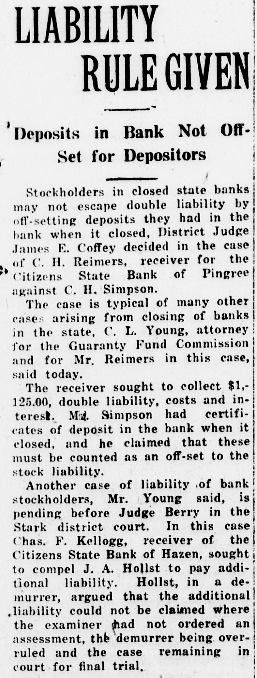 LIABILITY RULE GIVEN 'Deposits in Bank Not OffSet for Depositors Stockholders in closed state banks may not escape double liability by off's-ting deposits they had in the bank when it closed, District Judge James E. Coffey decided in the case of C. H. Reimers, receiver for the Citizens State Bank of Pingree against C. H. Simpson. The case is typical of many other cases arising from closing of banks in the state, C. L. Young, attorney for the Guaranty Fund Commission and for Mr. Reimers in this case, said today. The receiver sought to collect $1,125.00, double liability, costs and interest. Mat. Simpson had certificates of deposit in the bank when it closed, and he claimed that these must be counted as an off-set to the stock liability. Another case of liability of bank stockholders, Mr. Young said, is pending before Judge Berry in the Stark district court. In this case Chas. F. Kellogg, receiver of the Citizens State Bank of Hazen, sought to compel J. A. Hollst to pay additional liability. Hollst, in a demurrer, argued that the additional ,liability could not be claimed where the examiner had not ordered an assessment, the demurrer being overruled and the case remaining in court for final trial.