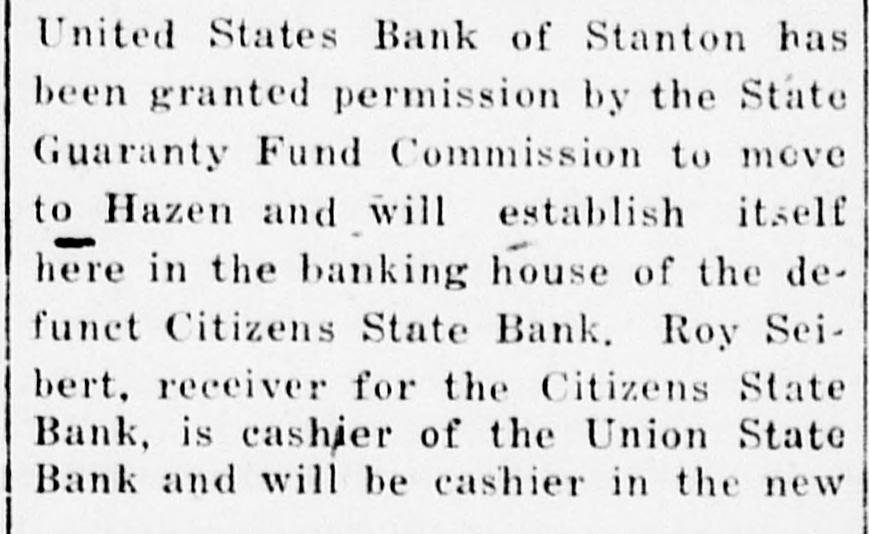 United States Bank of Stanton has been granted permission by the State Guaranty Fund Commission to move to Hazen and will establish itself here in the banking house of the defunct Citizens State Bank. Roy Seibert, receiver for the Citizens State Bank, is cashier of the Union State Bank and will be cashier in the new