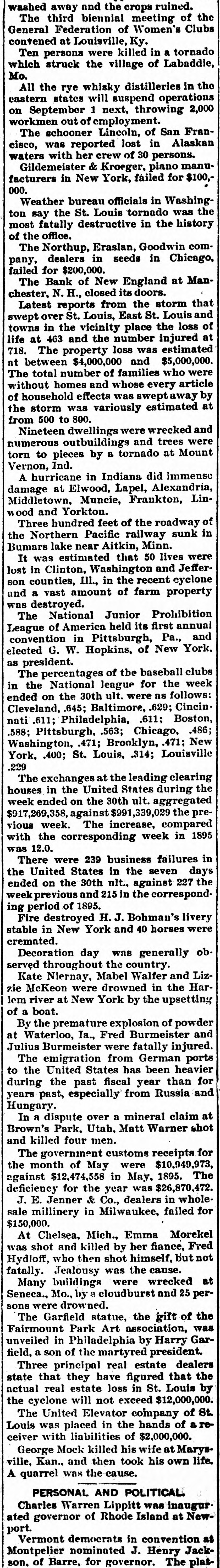 washed away and the crops ruined. The third biennial meeting of the General Federation of Women's Clubs convened at Louisville, Ky. Ten persons were killed in a tornado which struck the village of Labaddie, Mo. All the rye whisky distilleries in the eastern states will suspend operations on September 1 next, throwing 2,000 workmen out of employment. The schooner Lincoln, of San Francisco, was reported lost in Alaskan waters with her crew of 30 persons. Gildemeister & Kroeger, piano manufacturers in New York, failed for $100,000. Weather bureau officials in Washington say the St. Louis tornado was the most fatally destructive in the history of the office. The Northup, Eraslan, Goodwin company, dealers in seeds in Chicago, failed for $200,000. The Bank of New England at Manchester, N. H., closed its doors. Latest reports from the storm that swept over St. Louis, East St. Louis and towns in the vicinity place the loss of life at 463 and the number injured at 718. The property loss was estimated at between $4,000,000 and $5,000,000. The total number of families who were without homes and whose every article of household effects was sweptaway by the storm was variously estimated at from 500 to 800. Nineteen dwellings were wrecked and numerous outbuildings and trees were torn to pieces by a tornado at Mount Vernon, Ind. A hurricane in Indiana did immense damage at Elwood, Lapel, Alexandria, Middletown, Muncie, Frankton, Linwood and Yorkton. Three hundred feet of the roadway of the Northern Pacific railway sunk in Bumars lake near Aitkin, Minn. It was estimated that 50 lives were lost in Clinton, Washington and Jefferson counties, III., in the recent cyclone and a vast amount of farm property was destroyed. The National Junior Prohibition League of America held its first annual convention in Pittsburgh, Pa., and elected G. W. Hopkins, of New York. as president. The percentages of the baseball clubs in the National league for the week ended on the 30th ult. were as follows: Cleveland, 645; Baltimore, .629; Cincinnati .611; Philadelphia, .611; Boston, .588; Pittsburgh, .563; Chicago, .486; Washington, .471; Brooklyn, .471; New York, .400; St. Louis, .314; Louisville .229 The exchanges at the leading clearing houses in the United States during the week ended on the 30th ult. aggregated $917,269,358, against $991,339,029 the previous week. The increase, compared with the corresponding week in 1895 was 12.0. There were 239 business failures in the United States in the seven days ended on the 30th ult., against 227 the week previous and 215 in the corresponding period of 1895. Fire destroyed H. J. Bohman's livery stable in New York and 40 horses were cremated. Decoration day was generally ob. served throughout the country. Kate Niernay, Mabel Walfer and Lizzie McKeon were drowned in the Harlem river at New York by the upsetting of a boat. By the premature explosion of powder at Waterloo, Ia., Fred Burmeister and Julius Burmeister were fatally injured. The emigration from German ports to the United States has been heavier during the past fiscal year than for years past, especially from Russia and Hungary. In я dispute over a mineral claim at Brown's Park, Utah, Matt Warner shot and killed four men. The government customs receipts for the month of May were $10,949,973, against $12,474,558 in May. 1895. The deficiency for the year was $26,870,472. J. E. Jenner & Co., dealers in wholesale millinery in Milwaukee, failed for $150,000. At Chelsea, Mich., Emma Morekel was shot and killed by her fiance, Fred Hydloff, who then shot himself, but not fatally. Jealousy was the cause. Many buildings were wrecked at Seneca., Mo., by a cloudburst and 25 persons were drowned. The Garfield statue, the gift of the Fairmount Park Art association, was unveiled in Philadelphia by Harry Garfield, a son of the martyred president. Three principal real estate dealers state that they have figured that the actual real estate loss in St. Louis by the cyclone will not exceed $12,000,000. The United Elevator company of St. Louis was placed in the hands of a receiver with liabilities of $2,000,000. George Mock killed his wife at Marysville, Kan., and then took his own life. A quarrel was the cause. PERSONAL AND POLITICAL. Charles Warren Lippitt was inaugur. ated governor of Rhode Island at Newport. Vermont democrats in convention at Montpelier nominated J. Henry Jack-