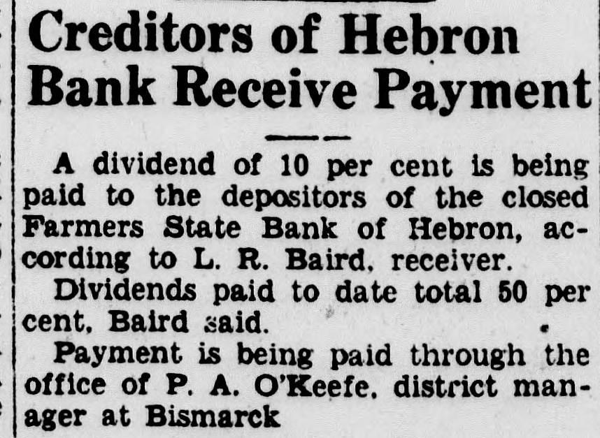 Creditors of Hebron Bank Receive Payment A dividend of 10 per cent is being paid to the depositors of the closed Farmers State Bank of Hebron, according to L. R. Baird. receiver. Dividends paid to date total 50 per cent. Baird said. Payment is being paid through the office of P. A. O'Keefe. district manager at Bismarck