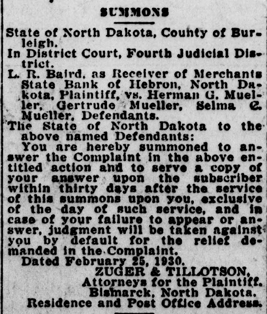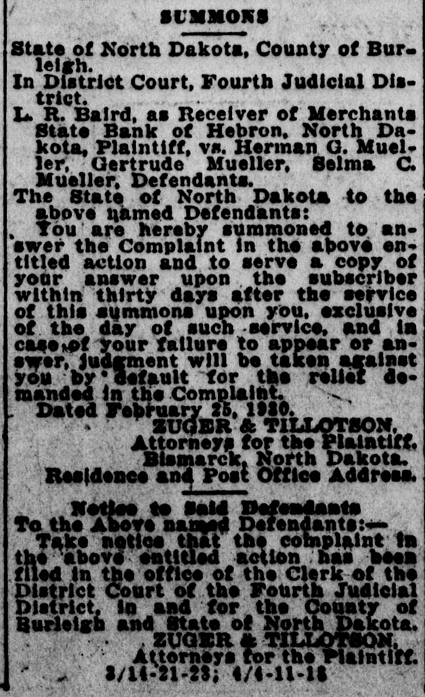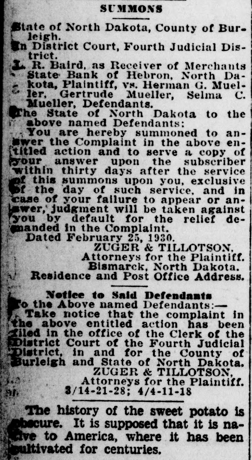 SUMMONS State of North Dakota, County of Burleigh. n District Court, Fourth Judicial District. R. Baird, as Receiver of Merchants State Bank of Hebron, North Dakota, Plaintiff, vs. Herman G. Mueller, Gertrude Mueller, Selma C. Mueller, Defendants. The State of North Dakota to the above named Defendants: You are hereby summoned to answer the Complaint in the above entitled action and to serve a copy of your answer upon the subscriber within thirty days after the service of this summons upon you, exclusive of the day of such service, and in case of your failure to appear or anwer, judgment will be taken against you by default for the relief demanded in the Complaint. Dated February 25, 1930. ZUGER & TILLOTSON. Attorneys for the Plaintiff. Bismarck, North Dakota. Residence and Post Office Address. Notice to Said Defendants to the Above named Defendants:Take notice that the complaint in the above entitled action has been filed in the office of the Clerk of the District Court of the Fourth Judicial District, in and for the County of Burleigh and State of North Dakota. ZUGER & TILLOTSON, Attorneys for the Plaintiff. 3/14-21-28; 4/4-11-18 The history of the sweet potato is cure. It is supposed that it is naLive to America, where it has been ltivated for centuries.