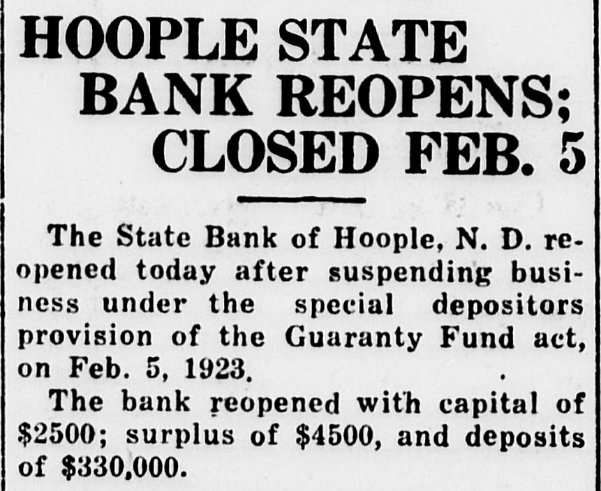 HOOPLE STATE BANK REOPENS; CLOSED FEB. 5 The State Bank of Hoople, N. D. reopened today after suspending business under the special depositors provision of the Guaranty Fund act, on Feb. 5, 1923. The bank reopened with capital of $2500; surplus of $4500, and deposits of $330,000.