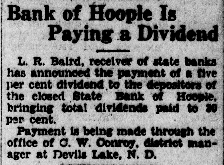 Bank of Hoople Is Paying a Dividend L. R. Baird, receiver of state banks has announced the payment of a five per cent dividend to the depositors of the closed State Bank of Hoople, bringing total dividends paid to 30 per cent. Payment is being made through the office of σ. W. Conroy, district manager at Devils Lake, N.D.