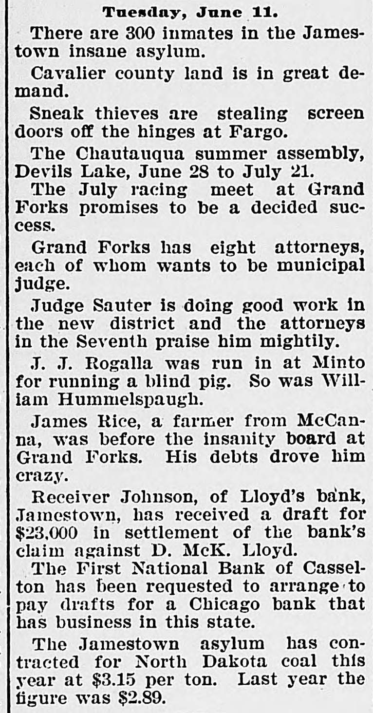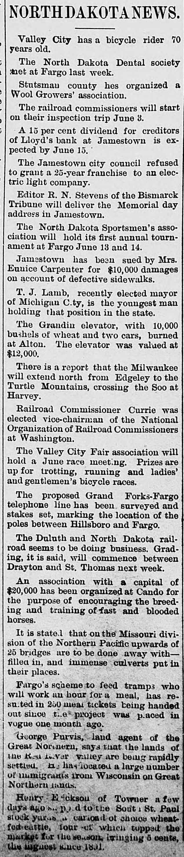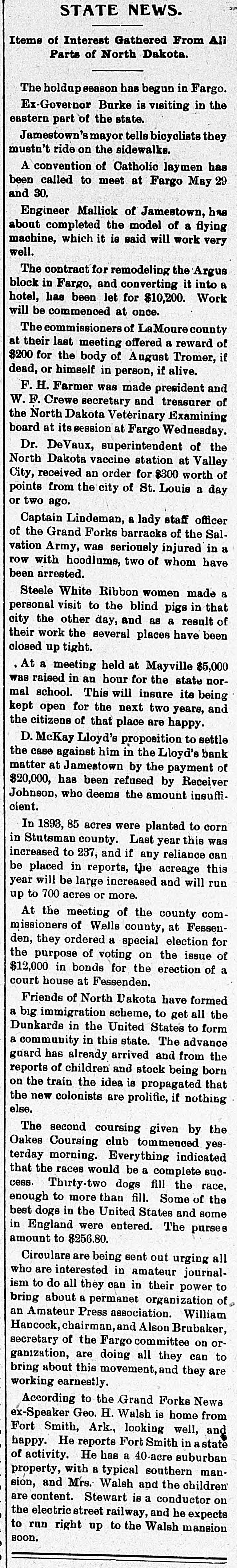 # STATE NEWS. Items of Interest Gathered From All Parts of North Dakota. The holdup season has begun in Fargo. Ex-Governor Burke is visiting in the eastern part of the state. Jamestown's mayor tells bicyclists they mustn't ride on the sidewalks. A convention of Catholic laymen has been called to meet at Fargo May 29 and 30. Engineer Mallick of Jamestown, has about completed the model of a flying machine, which it is said will work very well. The contract for remodeling the Argus block in Fargo, and converting it into a hotel, has been let for $10,200. Work will be commenced at once. The commissioners of LaMoure county at their last meeting offered a reward of $200 for the body of August Tromer, if dead, or himself in person, if alive. F. H. Farmer was made president and W. F. Crewe secretary and treasurer of the North Dakota Veterinary Examining board at its session at Fargo Wednesday. Dr. DeVaux, superintendent of the North Dakota vaccine station at Valley City, received an order for $300 worth of points from the city of St. Louis a day or two ago. Captain Lindeman, a lady staff officer of the Grand Forks barracks of the Salvation Army, was seriously injured in a row with hoodlums, two of whom have been arrested. Steele White Ribbon women made a personal visit to the blind pigs in that city the other day, and as a result of their work the several places have been closed up tight. At a meeting held at Mayville $5,000 was raised in an hour for the state normal school. This will insure its being kept open for the next two years, and the citizens of that place are happy. D. McKay Lloyd's proposition to settle the case against him in the Lloyd's bank matter at Jamestown by the payment of $20,000, has been refused by Receiver Johnson, who deems the amount insufficient. In 1893, 85 acres were planted to corn in Stutsman county. Last year this was increased to 237, and if any reliance can be placed in reports, the acreage this year will be large increased and will run up to 700 acres or more. At the meeting of the county commissioners of Wells county, at Fessenden, they ordered a special election for the purpose of voting on the issue of $12,000 in bonds for the erection of a court house at Fessenden. Friends of North Dakota have formed a big immigration scheme, to get all the Dunkards in the United States to form a community in this state. The advance guard has already arrived and from the reports of children and stock being born on the train the idea is propagated that the new colonists are prolific, if nothing else. The second coursing given by the Oakes Coursing club commenced yesterday morning. Everything indicated that the races would be a complete success. Thirty-two dogs fill the race, enough to more than fill. Some of the best dogs in the United States and some in England were entered. The purses amount to $256.80. Circulars are being sent out urging all who are interested in amateur journalism to do all they can in their power to bring about a permanet organization of an Amateur Press association. William Hancock, chairman, and Alson Brubaker, secretary of the Fargo committee on organization, are doing all they can to bring about this movement, and they are working earnestly. According to the Grand Forks News ex-Speaker Geo. H. Walsh is home from Fort Smith, Ark., looking well, and happy. He reports Fort Smith in a state of activity. He has a 40-acre suburban property, with a typical southern-mansion, and Mrs. Walsh and the children are content. Stewart is a conductor on the electric street railway, and he expects to run right up to the Walsh mansion soon.