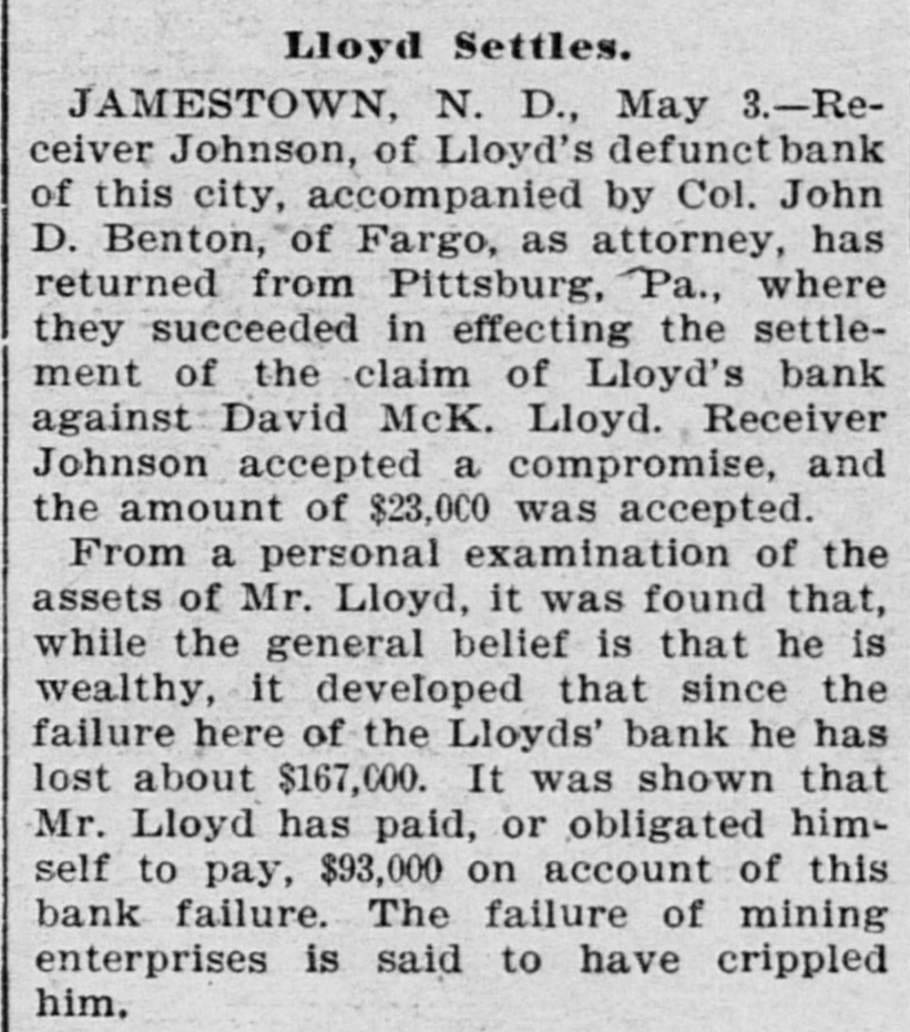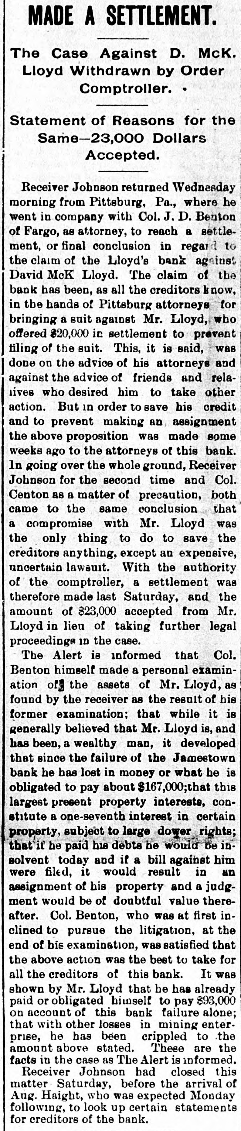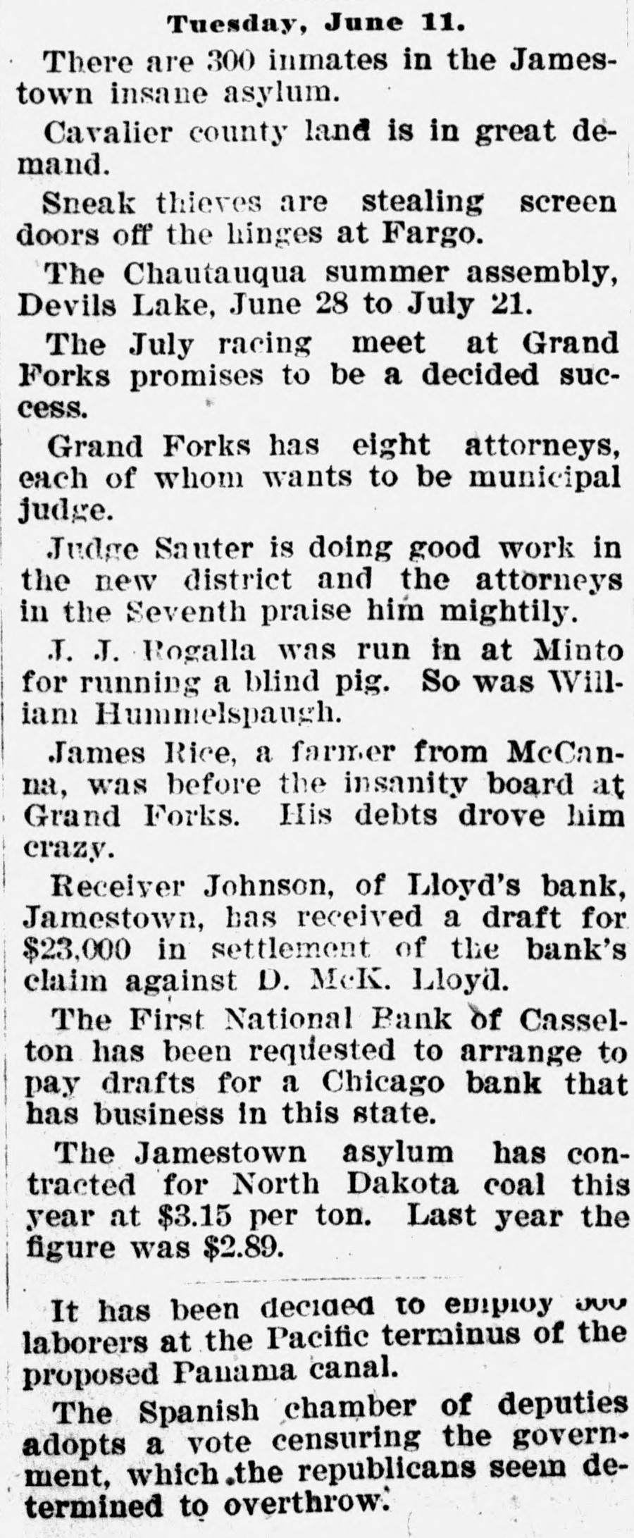# STATE NEWS. Items of Interest Gathered From All Parts of North Dakota. The holdup season has begun in Fargo. Ex-Governor Burke is visiting in the eastern part of the state. Jamestown's mayor tells bicyclists they mustn't ride on the sidewalks. A convention of Catholic laymen has been called to meet at Fargo May 29 and 30. Engineer Mallick of Jamestown, has about completed the model of a flying machine, which it is said will work very well. The contract for remodeling the Argus block in Fargo, and converting it into a hotel, has been let for $10,200. Work will be commenced at once. The commissioners of LaMoure county at their last meeting offered a reward of $200 for the body of August Tromer, if dead, or himself in person, if alive. F. H. Farmer was made president and W. F. Crewe secretary and treasurer of the North Dakota Veterinary Examining board at its session at Fargo Wednesday. Dr. DeVaux, superintendent of the North Dakota vaccine station at Valley City, received an order for $300 worth of points from the city of St. Louis a day or two ago. Captain Lindeman, a lady staff officer of the Grand Forks barracks of the Salvation Army, was seriously injured in a row with hoodlums, two of whom have been arrested. Steele White Ribbon women made a personal visit to the blind pigs in that city the other day, and as a result of their work the several places have been closed up tight. At a meeting held at Mayville $5,000 was raised in an hour for the state normal school. This will insure its being kept open for the next two years, and the citizens of that place are happy. D. McKay Lloyd's proposition to settle the case against him in the Lloyd's bank matter at Jamestown by the payment of $20,000, has been refused by Receiver Johnson, who deems the amount insufficient. In 1893, 85 acres were planted to corn in Stutsman county. Last year this was increased to 237, and if any reliance can be placed in reports, the acreage this year will be large increased and will run up to 700 acres or more. At the meeting of the county commissioners of Wells county, at Fessenden, they ordered a special election for the purpose of voting on the issue of $12,000 in bonds for the erection of a court house at Fessenden. Friends of North Dakota have formed a big immigration scheme, to get all the Dunkards in the United States to form a community in this state. The advance guard has already arrived and from the reports of children and stock being born on the train the idea is propagated that the new colonists are prolific, if nothing else. The second coursing given by the Oakes Coursing club commenced yesterday morning. Everything indicated that the races would be a complete success. Thirty-two dogs fill the race, enough to more than fill. Some of the best dogs in the United States and some in England were entered. The purses amount to $256.80. Circulars are being sent out urging all who are interested in amateur journalism to do all they can in their power to bring about a permanet organization of an Amateur Press association. William Hancock, chairman, and Alson Brubaker, secretary of the Fargo committee on organization, are doing all they can to bring about this movement, and they are working earnestly. According to the Grand Forks News ex-Speaker Geo. H. Walsh is home from Fort Smith, Ark., looking well, and happy. He reports Fort Smith in a state of activity. He has a 40-acre suburban property, with a typical southern-mansion, and Mrs. Walsh and the children are content. Stewart is a conductor on the electric street railway, and he expects to run right up to the Walsh mansion soon.