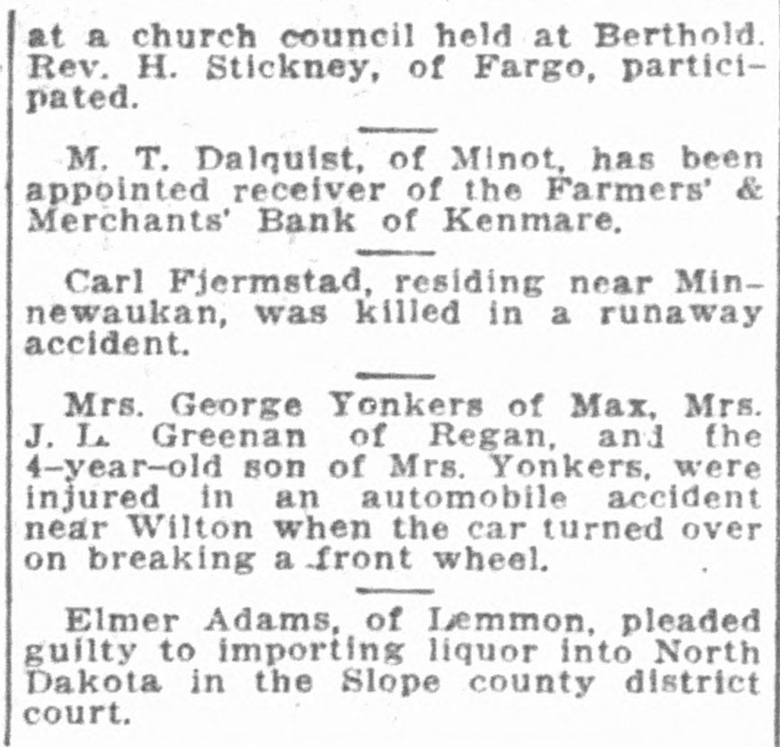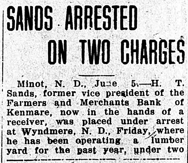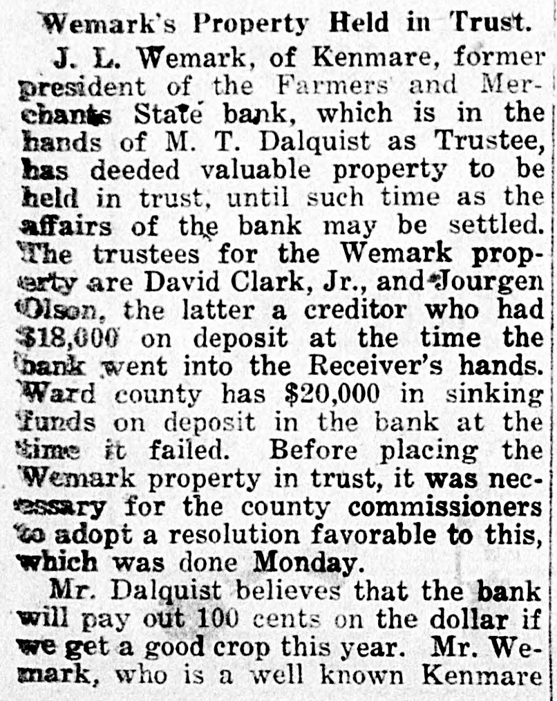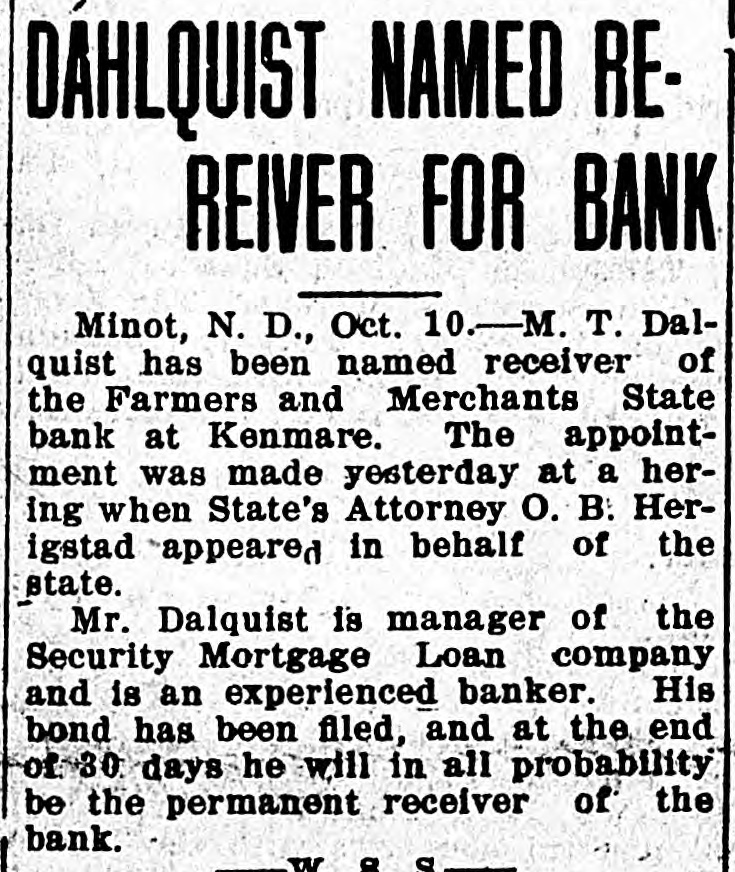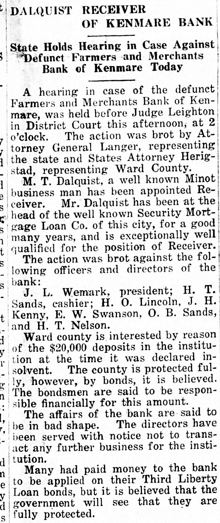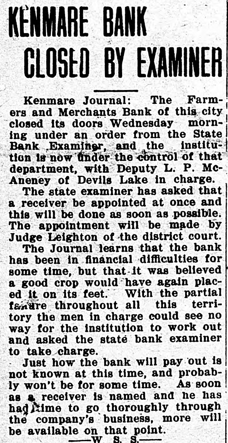 KENMARE BANK CLOSED BY EXAMINER FarmThe Kenmare Journal: ers and Merchants Bank of this city closed its doors Wednesday morning under an order from the State Bank Examiner, and the institution is now under the control of that department, with Deputy L. P. McAneney of Devils Lake in charge. The state examiner has asked that a receiver be appointed at once and this will be done as soon as possible. The appointment will be made by Judge Leighton of the district court. The Journal learns that the bank has been in financial difficulties for some time, but that it was believed a good crop would have again placed it on its feet. With the partial fanure throughout all this territory the men in charge could see no way for the institution to work out and asked the state bank examiner to take charge. Just how the bank will pay out is not known at this time, and probably won't be for some time. As soon as a receiver is named and he has had lime to go thoroughly through the company's business, more will be available on that point. -W S. S. -