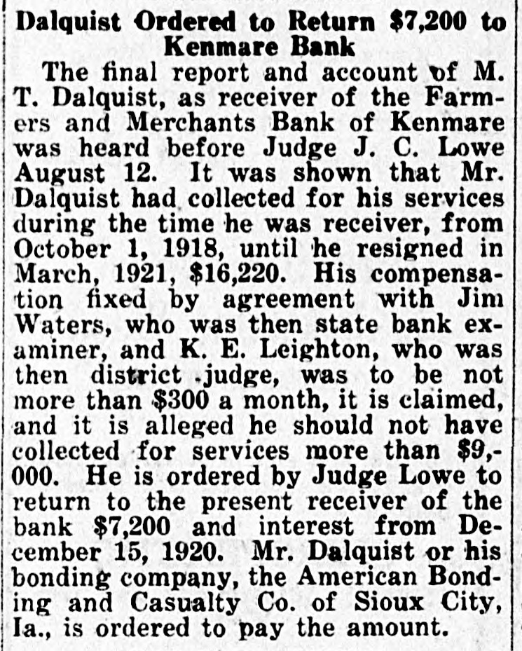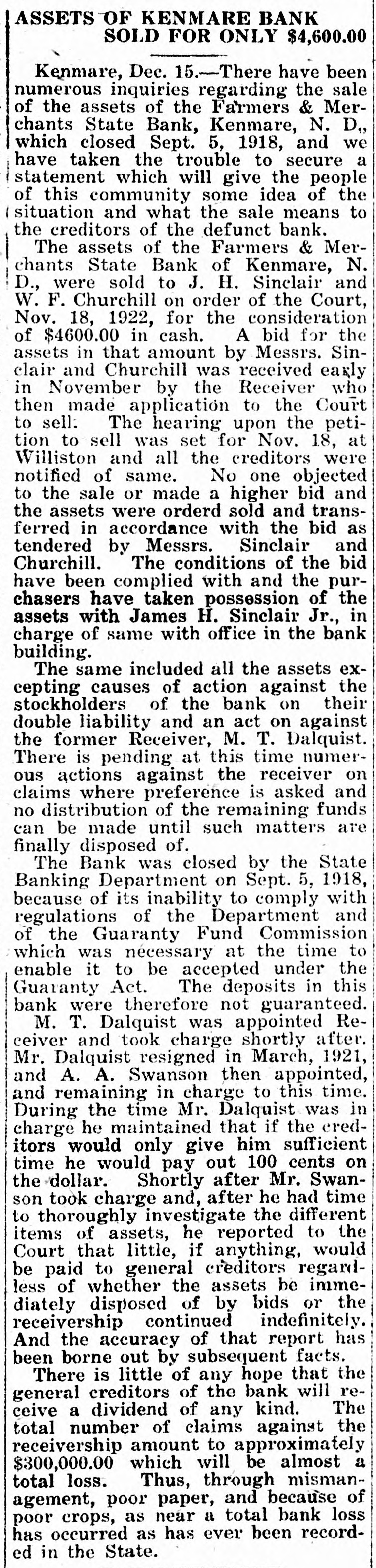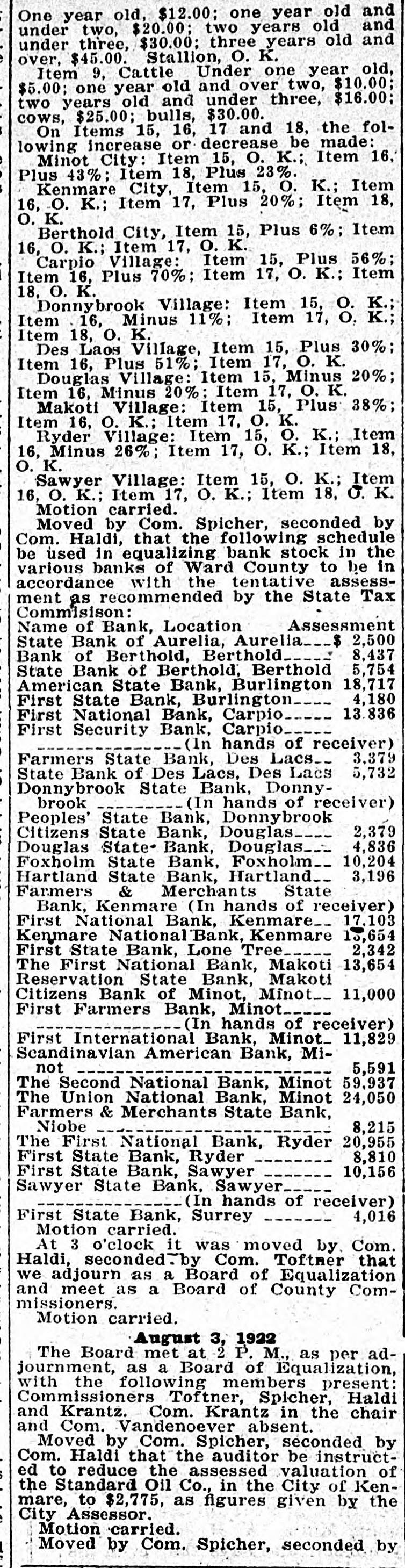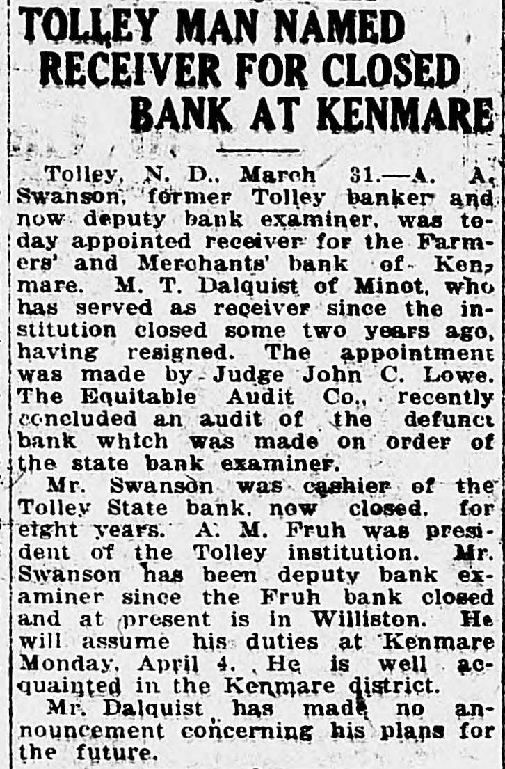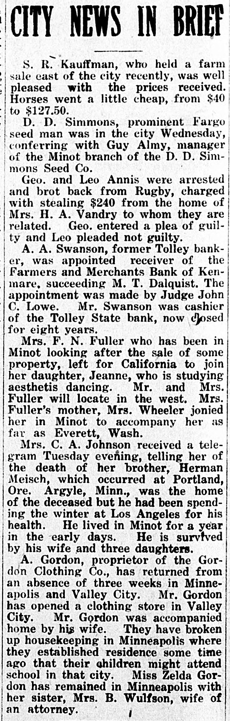CITY NEWS IN BRIEF S. R. Kauffman, who held a farm sale east of the city recently, was well pleased with the prices received. Horses went a little cheap, from $40 to $127.50. D. D. Simmons, prominent Fargo seed man was in the city Wednesday, conferring with Guy Almy, manager of the Minot branch of the D. D. Simmons Seed Co. Geo. and Leo Annis were arrested and brot back from Rugby, charged with stealing $240 from the home of Mrs. H. A. Vandry to whom they are related. Geo. entered a plea of guilty and Leo pleaded not guilty. A. A. Swanson, former Tolley banker, was appointed receiver of the Farmers and Merchants Bank of Kenmare, succeeding M. T. Dalquist. The appointment was made by Judge John C. Lowe. Mr. Swanson was cashier of the Tolley State bank, now closed for eight years. Mrs. F. N. Fuller who has been in Minot looking after the sale of some property, left for California to join her daughter, Jeanne, who is studying aesthetis dancing. Mr. and Mrs. Fuller will locate in the west. Mrs. Fuller's mother, Mrs. Wheeler jonied her in Minot to accompany her as far as Everett, Wash. Mrs. C. A. Johnson received a telegram Tuesday evening, telling her of the death of her brother, Herman Meisch, which occurred at Portland, Ore. Argyle, Minn., was the home of the deceased but he had been spending the winter at Los Angeles for his health. He lived in Minot for a year in the early days. He is survived by his wife and three daughters. A. Gordon, proprietor of the Gordon Clothing Co., has returned from an absence of three weeks in Minneapolis and Valley City. Mr. Gordon has opened a clothing store in Valley City. Mr. Gordon was accompanied home by his wife. They have broken up housekeeping in Minneapolis where they established residence some time ago that their children might attend school in that city. Miss Zelda Gordon has remained in Minneapolis with her sister, Mrs. B. Wulfson, wife of an attorney. I