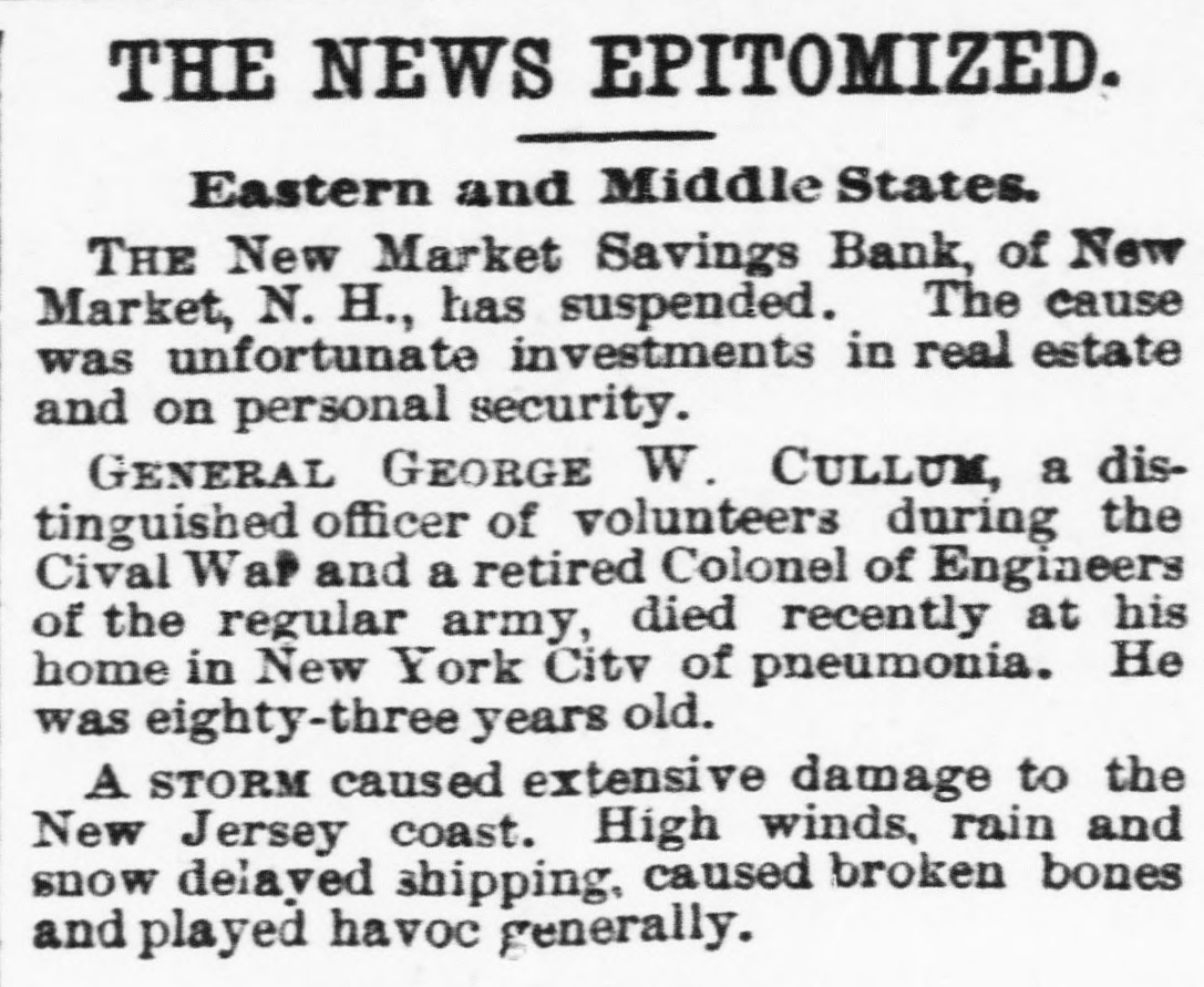 THE NEWS EPITOMIZED, Eastern and Middle States. THE New Market Savings Bank, of New Market, N. H., has suspended. The cause was unfortunate investments in real estate and on personal security. GENERAL GEORGE W. CULLUM, a distinguished officer of volunteers during the Cival War and a retired Colonel of Engineers of the regular army, died recently at his home in New York City of pneumonia. He was eighty-three years old. A STORM caused extensive damage to the New Jersey coast. High winds, rain and snow delayed shipping, caused broken bones and played havoc generally.