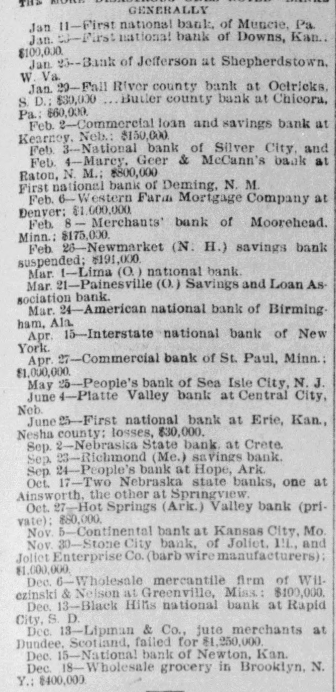 Jan 11-First national bank of Muncie, Pa. Jan. Co-Firstinational bank of Downs, Kan.. $100,000. Jan. 23--Bank of Jefferson at Shepherdstown. W. Va. Jan. 29-Fall River county bank at Oetricks. Butler county bank at Chicora, S.D.; $30,000 Pa.: $60,000. Feb. 2-Commercial loan and savings bank at Kearney, Neb.: $150,000. Feb. 3-National bank of Silver City, and Feb. 4-Marcy. Geer & McCann's bank at Raton, N.M.; $800,000 First national bank of Deming, N. M. Feb. 6- Western Farm Mortgage Company at Denver: $1,000,000. Feb. 8 - Merchants' bank of Moorehead. Minn.: $175,000. Feb. 26-Newmarket (N. H.) savings bank suspended; $191,000. Mar. 1-Lima (O.) national bank. Mar. 21-Painesville (O.) Savings and Loan Association bank. Mar. 24-American national bank of Birming. ham, Ala. Apr. 15-Interstate national bank of New York. Apr. 27-Commercial bank of St. Paul, Minn.: $1,000,000. May 25-People's bank of Sea Isle City, N.J. June 4-Platte Valley bank at Central City, Neb. June 25-First national bank at Erie, Kan., Nesha county: losses, $30,000. Sep. 2-Nebraska State bank. at Crète. Sep. 23-Richmond (Me.) savings bank. Sep. 24-People's bank at Hope, Ark. Oct. 17-Two Nebraska state banks, one at Ainsworth, the other at Springview. Oct. 27-Hot Springs (Ark.) Valley bank (private); $80,000. Nov. 5-Continental bank at Kansas City, Mo. Nov. 30-Stone City bank, of Joliet, I!I., and Joliet Enterprise Co. (barb wire manufacturers): $1.000,000. Dec. 6-Wholesale mercantile firm of Wilezinski & Nelson at Greenville, Miss.: $100,000. Dec. 13-Black Hills national bank at Rapid City, S. D. Dec. 13-Lipman & Co., jute merchants at Dundee, Scotland, failed for $1,250,000. Dec. 15-National bank of Newton, Kan. Dec. 18-Wholesale grocery in Brooklyn, N. Y.: $400,000.