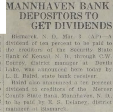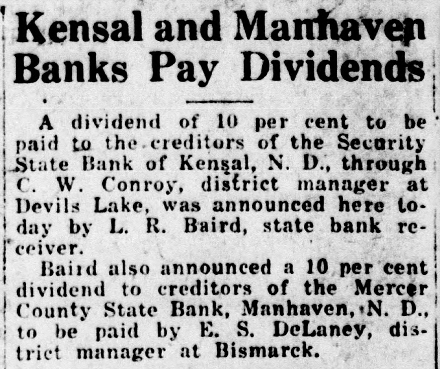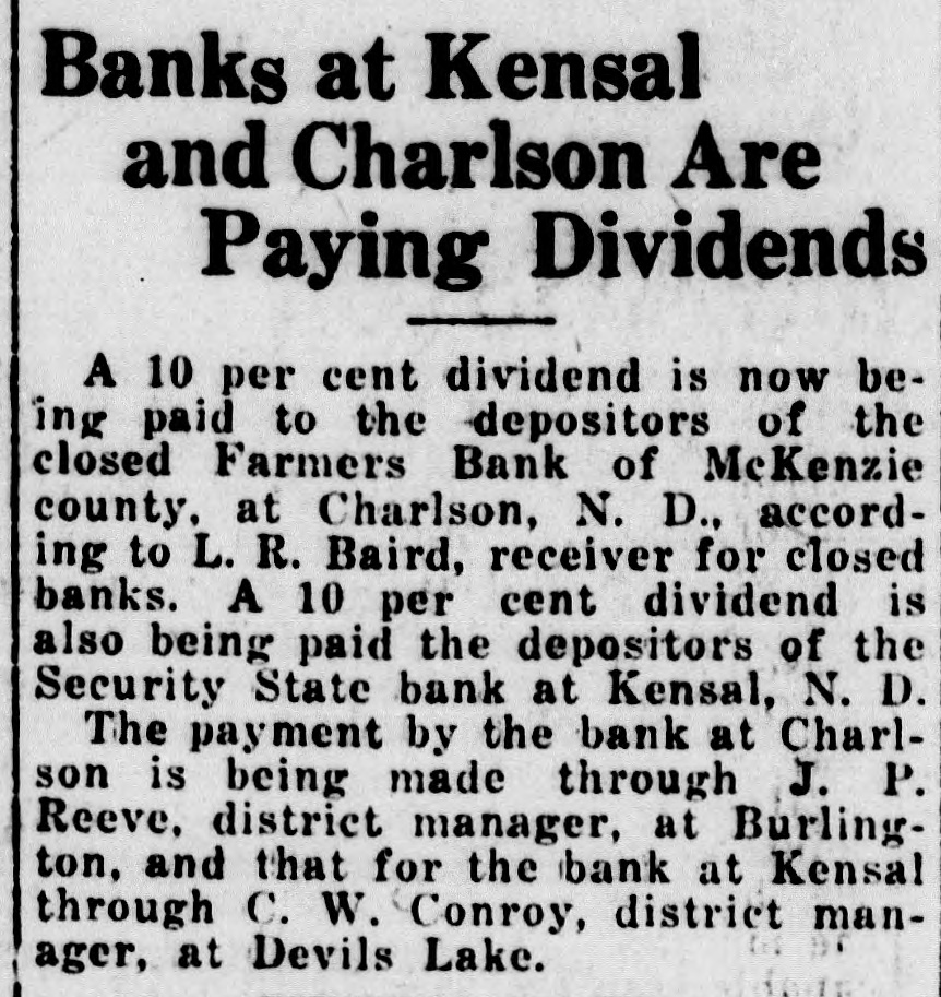 DIVIDENDS TO BE PAID BY 10 CLOSED BANKS State Receiver Baird Announces Payments Through District Offices Dividends to be paid to the depositors in 10 closed banks were announced here today by L. R. Baird, state receiver of closed banks. Five dividends to be paid through the office of C. W. Conroy, district manager at Devils Lake, are: Security Bank of Oberon, a second dividend of 10 per cent; Security State Bank, Kensal, second dividend of 10 per cent; Farmers State Bank, Hesper, second dividend of 15 per cent; Karnak State Bank, second dividend of 20 per cent; Security State Bank, Brantford, a dividend of 10 per cent. Two dividends will be paid through the office of G. R. Van Sickle, district manager at Minot, as follows: Farmers and Merchants State Bank, Barton, 20 per cent; Towner State Bank, Towner, a second dividend of 30 per cent. Three dividends will be paid through the office of J. P. Reeve, district manager at Burlington, as follows: Farmers State Bank, Noonan, a second dividend of 20 per cent; Citizens State Bank, Flaxton, second dividend of 10 per cent; First State Bank, Lansford, second dividend of 10 per cent.
