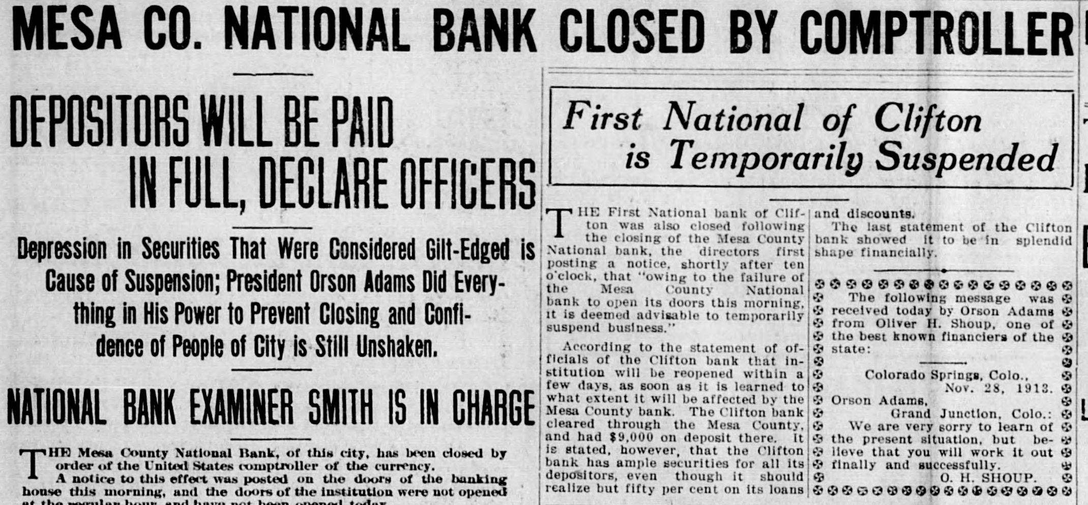 MESA CO. NATIONAL BANK CLOSED BY COMPTROLLER First National of Clifton DEPOSITORS WILL BE PAID is Temporarily Suspended IN FULL, DECLARE OFFICERS HE First National bank of Clifand discounts. The last statement of the Clifton ton was also closed following T' the closing of the Mesa County bank showed it to be in splendid National bank, the directors first shape financially. Depression in Securities That Were Considered Gilt-Edged is posting a notice, shortly after ten o'clock, that "owing to the failure of the Mesa County National Cause of Suspension; President Orson Adams Did EveryThe following message was bank to open its doors this morning, received today by Orson Adams it is deemed advisable to temporarily thing in His Power to Prevent Closing and Confifrom Oliver H. Shoup, one of suspend business." the best known financiers of the According to the statement of ofstate: dence of People of City is Still Unshaken. ficials of the Clifton bank that institution will be reopened within Colorado Springs, Colo., few days, as soon as it is learned to Nov. 28, 1913. what extent it will be affected by the Orson Adams, Mesa County bank. The Clifton bank Grand Junction, Colo.: NATIONAL BANK EXAMINER SMITH IS IN CHARGE cleared through the Mesa County, We are very sorry to learn of and had $9,000 on deposit there. It the present situation, but beis stated, however, that the Clifton Heve that you will work it out HE Mesa County National Bank, of this city, has been closed by bank has ample securities for all its finally and successfully. order of the United States comptroller of the currency. T" depositors, even though it should O. H. SHOUP. A notice to this effect was posted on the doors of the banking realize but fifty per cent on its loans house this morning, and the doors of the institution were not opened
