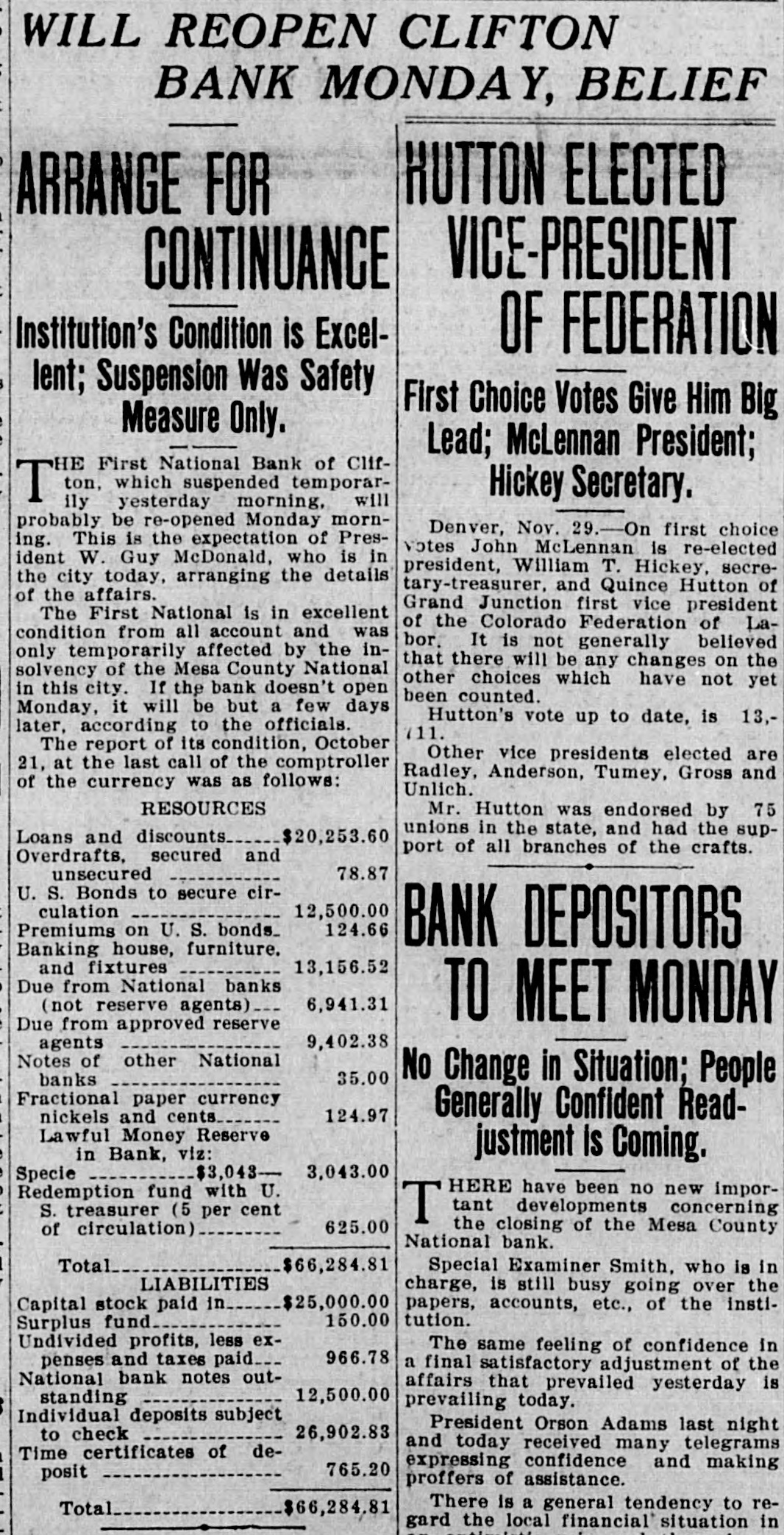 The First National bank of Clifton, which suspended temporar[ily] yesterday morning, will probably be re-opened Monday... The First National Bank of Clifton, which cleared through the Mesa County Bank, was closed temporarily to prevent a run.