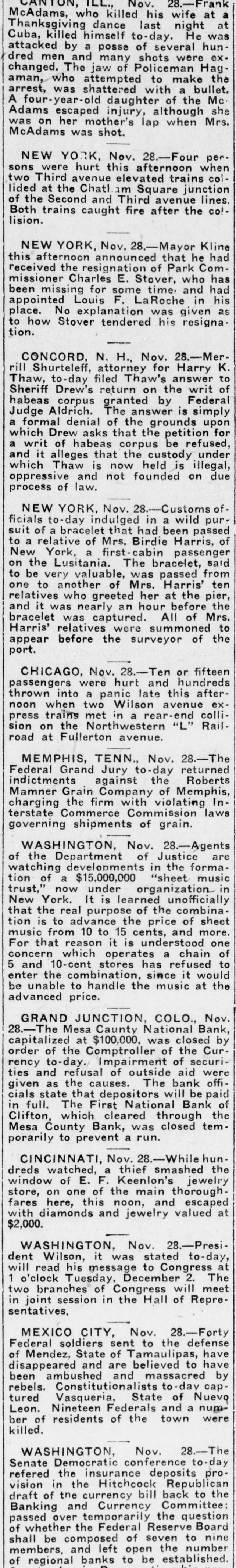 ILL., Nov. 28.-Frank McAdams, who killed his wife at a Thanksgiving dance last night at Cuba, killed himself to-day. He was attacked by a posse of several hundred men and many shots were exchanged. The jaw of Policeman Hagaman, who attempted to make the arrest, was shattered with a bullet. A four-year-old daughter of the Mc. Adams escaped injury, although she was on her mother's lap when Mrs. McAdams was shot. NEW YORK, Nov. 28.-Four persons were hurt this afternoon when two Third avenue elevated trains collided at the Chatl am Square junction of the Second and Third avenue lines. Both trains caught fire after the collision. NEW YORK, Nov. 28.-Mayor Kline this afternoon announced that he had received the resignation of Park Commissioner Charles E. Stover, who has been missing for some time, and had appointed Louis F. LaRoche in his place. No explanation was given as to how Stover tendered his resignation. CONCORD. N. H., Nov. 28.-Merrill Shurteleff, attorney for Harry K. Thaw, to-day filed Thaw's answer to Sheriff Drew's return on the writ of habeas corpus granted by Federal Judge Aldrich. The answer is simply a formal denial of the grounds upon which Drew asks that the petition for a writ of habeas corpus be refused, and it alleges that the custody under which Thaw is now held is illegal, oppressive and not founded on due process of law. NEW YORK, Nov. 28.-Customs of ficials to-day indulged in a wild pursuit of a bracelet that had been passed to a relative of Mrs. Birdie Harris, of New York, a first-cabin passenger on the Lusitania. The bracelet, said to be very valuable, was passed from one to another of Mrs. Harris' ten relatives who greeted her at the pier, and it was nearly an hour before the bracelet was captured. All of Mrs. Harris' relatives were summoned to appear before the surveyor of the port. CHICAGO, Nov. 28.-Ten or fifteen passengers were hurt and hundreds thrown into a panic late this afternoon when two Wilson avenue express trains met in a rear-end collision on the Northwestern "L" Railroad at Fullerton avenue. MEMPHIS, TENN., Nov. 28.-The Federal Grand Jury to-day returned indictments against the Roberts Mamner Grain Company of Memphis, charging the firm with violating Interstate Commerce Commission laws governing shipments of grain. WASHINGTON, Nov. 28.-Agents of the Department of Justice are watching developments in the formation of a $15,000,000 "sheet music trust," now under organization. in New York. It is learned unofficially that the real purpose of the combination is to advance the price of sheet music from 10 to 15 cents, and more. For that reason it is understood one concern which operates a chain of 5 and 10-cent stores has refused to enter the combination, since it would be unable to handle the music at the advanced price. GRAND JUNCTION, COLO., Nov. 28.-The Mesa Caunty National Bank, capitalized at $100,000, was closed by order of the Comptroller of the Currency to-day. Impairment of securities and refusal of outside aid were given as the causes. The bank officials state that depositors will be paid in full. The First National Bank of Clifton, which cleared through the Mesa County Bank, was closed temporarily to prevent a run. CINCINNATI, Nov. 28.-While hundreds watched, a thief smashed the window of E. F. Keenlon's jewelry store, on one of the main thoroughfares here, this noon, and escaped with diamonds and jewelry valued at $2,000. WASHINGTON, Nov. 28.-President Wilson, it was stated to-day, will read his message to Congress at 1 o'clock Tuesday, December 2. The two branches of Congress will meet in joint session in the Hall of Representatives, MEXICO CITY, Nov. 28.-Forty Federal soldiers sent to the defense of Mendez, State of Tamaulipas, have disappeared and are believed to have been ambushed and massacred by rebels. Constitutionalists to-day captured Vasqueria, State of Nuevo Leon. Nineteen Federals and a number of residents of the town were killed. WASHINGTON, Nov. 28.-The Senate Democratic conference to-day refered the insurance deposits provision in the Hitchcock Republican draft of the currency bill back to the Banking and Currency Committee: passed over temporarily the question of whether the Federal Reserve Board shall be composed of seven to nine members, and left open the number of regional banks to be established.