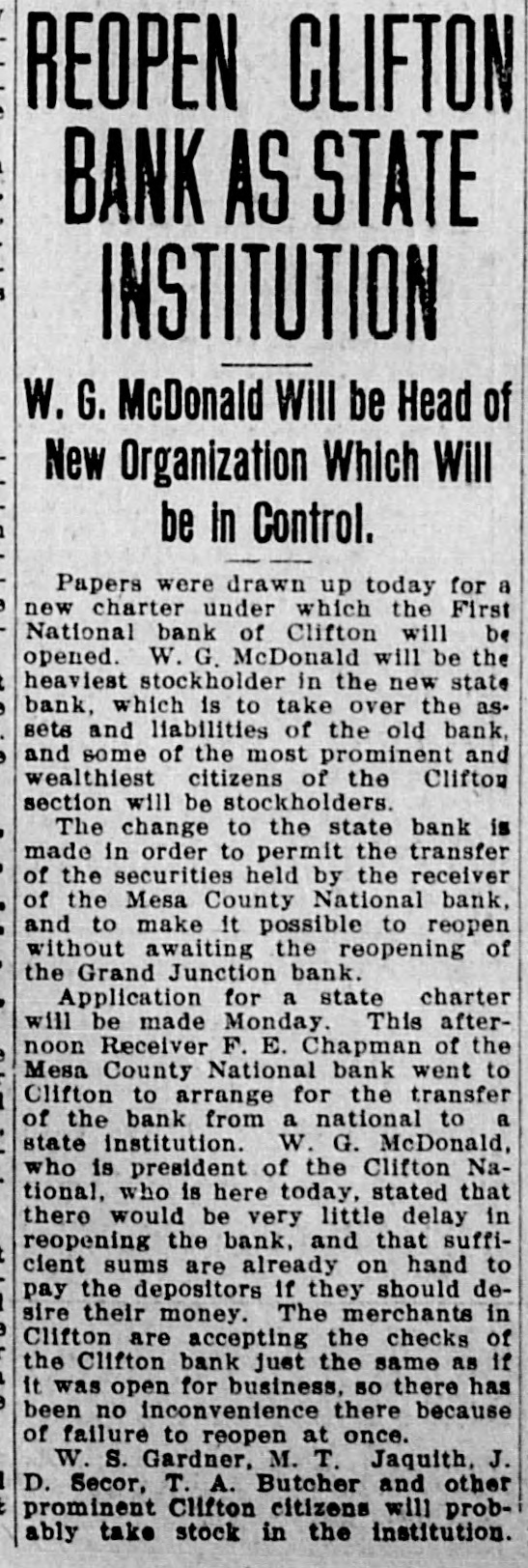 REOPEN CLIFTON BANK AS STATE INSTITUTION W. G. McDonald Will be Head of New Organization Which Will be in Control. Papers were drawn up today for a new charter under which the First National bank of Clifton will be opened. W. G. McDonald will be the heaviest stockholder in the new state bank, which is to take over the assets and liabilities of the old bank, and some of the most prominent and wealthiest citizens of the Clifton section will be stockholders. The change to the state bank is made in order to permit the transfer of the securities held by the receiver of the Mesa County National bank, and to make it possible to reopen without awaiting the reopening of the Grand Junction bank. Application for a state charter will be made Monday. This afternoon Receiver F. E. Chapman of the Mesa County National bank went to Clifton to arrange for the transfer of the bank from a national to a state institution. W. G. McDonald, who is president of the Clifton National, who is here today, stated that there would be very little delay in reopening the bank, and that sufficient sums are already on hand to pay the depositors if they should desire their money. The merchants in Clifton are accepting the checks of the Clifton bank just the same as if it was open for business, so there has been no inconvenience there because of failure to reopen at once. W. S. Gardner, M. T. Jaquith, J. D. Secor, T. A. Butcher and other prominent Clifton citizens will probably take stock in the institution.