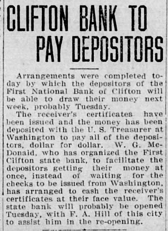CLIFTON BANK TO PAY DEPOSITORS Arrangements were completed today by which the depositors of the First National Bank of Clifton will be able to draw their money next week, probably Tuesday. The receiver's certificates have been issued and the money has been deposited with the U. S. Treasurer at Washington to pay all of the depositors, dollar for dollar. W. G. McDonald, who has organized the First Clifton state bank, to facilitate the depositors getting their money at once, instead of waiting for the checks to be issued from Washington, has arranged to cash the receiver's certificates at their face value. The state bank will probably be opened Tuesday, with F. A. Hill of this city to assist him in the re-opening.