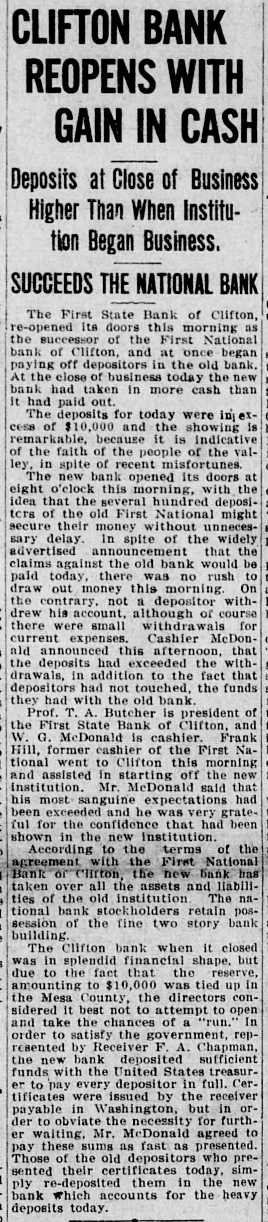 CLIFTON BANK REOPENS WITH GAIN IN CASH Deposits at Close of Business Higher Than When Institution Began Business. SUCCEEDS THE NATIONAL BANK The First State Bank of Clifton, re-opened its doors this morning as the successor of the First National bank of Clifton, and at once began paying off depositors in the old bank. At the close of business today the new bank had taken in more cash than it had paid out. The deposits for today were injercess of $10,000 and the showing is remarkable, because it is indicative of the faith of the people of the valley, in spite of recent misfortunes. The new bank opened its doors at eight o'clock this morning, with the idea that the several hundred depositcrs of the old First National might secure their money without unnecessary delay. In spite of the widely advertised announcement that the claims against the old bank would be paid today, there was no rush to draw out money this morning. On the contrary. not a depositor withdrew his account, although of course there were small withdrawals for current expenses. Cashier McDonald announced this afternoon, that the deposits had exceeded the withdrawals, in addition to the fact that depositors had not touched, the funds they had with the old bank. Prof. T. A. Butcher is president of the First State Bank of Clifton, and W. G. McDonald is cashier. Frank Hill, former cashier of the First National went to Clifton this morning and assisted in starting off the new institution. Mr. McDonald said that his most sanguine expectations had been exceeded and he was very grateful for the confidence that had been shown in the new institution. According to the terms of the agreement with the First National Bank of Clifton, the new bank has taken over all the assets and liabilities of the old institution. The national bank stockholders retain possession of the fine two story bank building. The Clifton bank when it closed was in splendid financial shape, but due to the fact that the reserve, amounting to $10,000 was tied up in the Mesa County, the directors considered it best not to attempt to open and take the chances of a "run." In order to satisfy the government, represented by Receiver F. A. Chapman, the new bank deposited sufficient funds with the United States treasurer to pay every depositor in full. Certificates were issued by the receiver payable in Washington, but in order to obviate the necessity for further waiting, Mr. McDonald agreed to pay these sums as fast as presented. Those of the old depositors who presented their certificates today, simply re-deposited them in the new bank which accounts for the heavy deposits today.