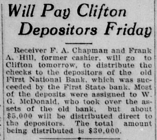 Will Pay Clifton Depositors Friday Receiver F.A. Chapman and Frank A. Hill, former cashier, will go to Clifton tomorrow, to distribute the checks to the depositors of the old First National Bank, which was succeeded by the First State bank. Most of the deposits were assigned to W. G. McDonald, who took over the assets of the old bank. but about $5,000 will be distributed direct to the depositors. The total amount being distributed is $30,000.