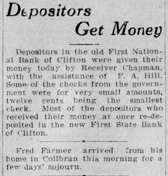 Depositors Get Money Depositors in the aid First National Bank of Clifton were given their money today by Receiver Chapman, with the assistance of F. A. Hill. Some of the checks from the government were for very small amounts, twelve cents being the smallest check. Most of the depositors who received their money at once re-deposited in the new First State Bank of Clifton. Fred Farmer arrived from his home in Collbran this morning for a few days' sojourn.