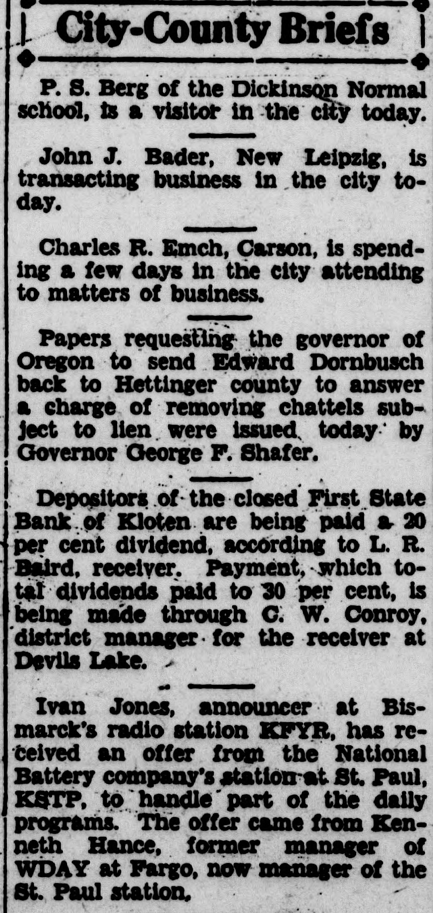 1 City-County Briefs P. S. Berg of the Dickinson Normal school, is a visitor in the city today. John J. Bader, New Leipzig, is transacting business in the city today. Charles R. Emch, Carson, is spending a few days in the city attending to matters of business. Papers requesting the governor of Oregon to send Edward Dornbusch back to Hettinger county to answer a charge of removing chattels subject to lien were issued, today by Governor George F. Shafer. Depositors of the closed First State Bank of Kloten are being paid & 20 per cent dividend, according to L. R. Baird, receiver. Payment, which total dividends paid to 30 per cent, is being made through C. W. Conroy, district manager. for the receiver at Devils Lake. : Ivan Jones, announcer at Bismarck's radio station KFYR, has received an offer from the National Battery company's station at St. Paul, KSTP, to handle part of the daily programs. The offer came from Kenneth Hance, former manager of WDAY at Fargo, now manager of the St. Paul station,