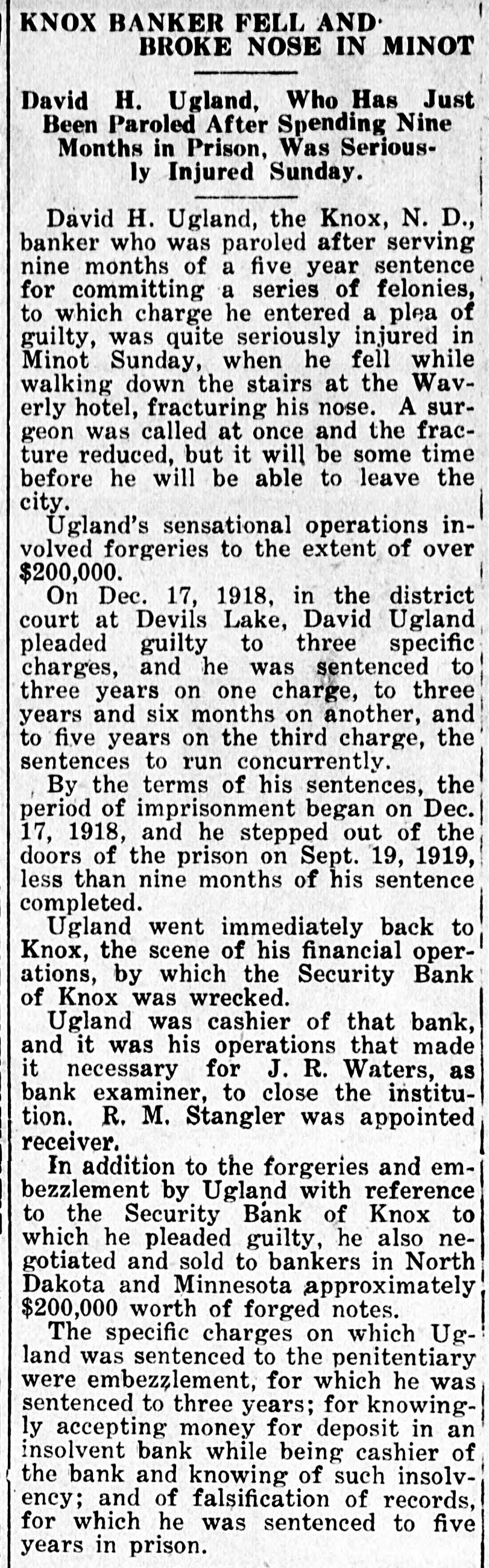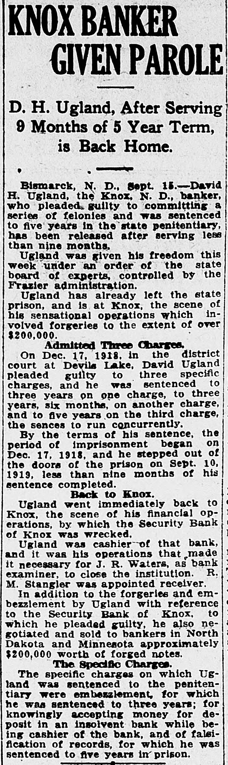 KNOX BANKER GIVEN PAROLE D. H. Ugland, After Serving 9 Months of 5 Year Term, is Back Home. Bismarck, N. D., Sept. 15.-David H. Ugland, the Knox, N. D., banker, who pleaded. guilty to committing a series of felonies and was sentenced to five years in the state penitentiary, has been released after serving less than nine months, Ugland was given his freedom this week under an order of the state board of experts, controlled by the Frazier administration. Ugland has already left the state prison, and is at Knox, the scene of his sensational operations which involved forgeries to the extent of over $200,000. Admitted Three Charges. On Dec. 17, 1918. in the district court at Devils Lake, David Ugland pleaded guilty to three specific charges, and he was sentenced to three years on one charge, to three years, six months, on another charge, and to five years on the third charge, the sences to run concurrently. By the terms of his sentence, the period of imprisonment began on Dec. 17, 1918, and he stepped out of the doors of the prison on Sept. 10, 1919, less than nine months of his sentence completed. Back to Knox. Ugland went immediately back to Knox, the scene of his financial operations, by which the Security Bank of Knox was wrecked. Ugland was cashier of that bank, and it was his operations that made it necessary for J. R. Waters, as bank examiner, to close the institution. R. M. Stangler was appointed receiver. In addition to the forgeries and embezzlement by Ugland with reference to the Security Bank of Knox. to which he pleaded guilty, he also negotiated and sold to bankers in North Dakota and Minnesota approximately $200,000 worth of forged notes. The Specific Charges. The specific charges on which Ugland was sentenced to the penitentiary were embezzlement, for which he was sentenced to three years; for knowingly accepting money for deposit in an insolvent bank while being cashier of the bank, and of falsification of records, for which he was sentenced to five years in prison.