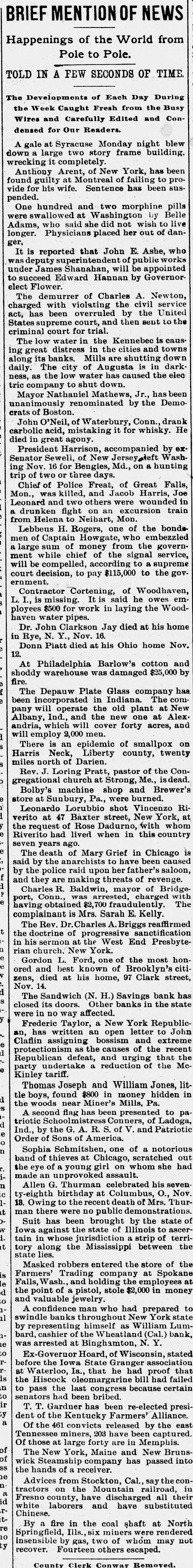 BRIEF MENTION OF NEWS Happenings of the World from Pole to Pole. TOLD IN A FEW SECONDS OF TIME. The Developments of Each Day During the Week Caught Fresh from the Busy Wires and Carefully Edited and Condensed for Our Readers. A gale at Syracuse Monday night blew down a large two story frame building. wrecking it completely. Anthony Arent, of New York, has been found guilty at Montreal of failing to provide for his wife. Sentence has been suspended. One hundred and two morphine pills were swallowed at Washington by Belle Adams, who said she did not wish to live longer. Physicians placed her out of danger, It is reported that John E. Ashe, who rasdeputy superintendent of public works under James Shanahan, will be appointed to succeed Edward Hannan by Governorelect Flower. The demurrer of Charles A. Newton, charged with violating the civil service act. has been overruled by the United States supreme court, and then sent to the criminal court for trial. The low water in the Kennebec is caus. ing great distress in the cities and towns along its banks. Mills are shutting down daily. The city of Augusta is in dark ness, as the low water has caused the elec tric company to shut down. Mayor Nathaniel Mathews, Jr., has been unanimously renominated by the Demo crats of Boston John O'Neil, of Waterbury, Conn., drank carbolic acid, mistaking it for whisky. He died in great agony. President Harrison, accompanied by exSenator Sewell, of New Jersey_left Washing Nov. 16 for Bengles, Md., on a hunting trip of two or three days. Chief of Police Freat, of Great Falls. Mon., was killed, and Jacob Harris, Joe Leonard and two others were wounded in a drunken fight on an excursion train from Helena to Neihart, Mon. Lebbeus H. Rogers, one of the bonds men of Captain Howgate, who embezzled a large sum of money from the government while chief of the signal service, will be compelled, according to a supreme court decision, to pay $115,000 to the government. Contractor Cortening, of Woodhaven, L I., is missing. It is said he owes em ployees $500 for work in laying the Woodhaven water pipes. Dr. John Clarkson Jay died at his home in Rye, N.Y., Nov. 16. Donn Piatt died at his Ohio home Nov. 12. At Philadelphia Barlow's cotton and shoddy warehouse was damaged $25,000 by fire. The Depauw Plate Glass company has been incorporated in Indiana. The company will operate the old plant at New Albany, Ind., and the new one at Alex andria, which will cover forty acres, and will employ 2,000 men. There is an epidemic of smallpox on Harris Neck, Liberty county, twenty miles north of Darien. Rev. J. Loring Pratt, pastor of the Congregational church at Strong, Me., s dead. Bolby's machine shop and Brewer's store at Sunbury, Pa., were burned. Leonardo Lorubbio shot Vincenzo Riverito at 47 Baxter street, New York, at the request of Rose Dadurno, with whom Riverito had lived when in this country seven years ago. The death of Mary Grief in Chicago is said by the anarchists to have been caused by the police raid upon her father's saloon, and they are making threats of revenge. Charles R. Baldwin, mayor of Bridge port, Conn., was arrested, charged with having obtained $2,700 fraudulently. The complainant is Mrs. Sarah E. Kelly. The Rev. Dr. Charles A. Briggs reaffirmed the doctrine of progressive sanctification in his sermon at the West End Presbyterian church, New York. Gordon L. Ford, one of the most honored and best known of Brooklyn's citizens, died at his home, 97 Clark street, Nov. 14. The Sandwich (N. H.) Savings bank has closed its doors. Other banks in the state were in no way affected. Frederic Taylor, a New York Republican, has written an open letter to John Claflin assigning bossism and extreme protectionism as the causes of the recent Republican defeat, and urging that the party undertake a reduction of the McKinley tariff. Thomas Joseph and William Jones, little boys, found $800 in money hidden in the woods near Miner's Mills, Pa. A second flag has been presented to patriotic Schoolmistres Conners, of Ladoga, d Ind., by the G. A. R. S. of V. and Patriotic Order of Sons of America. Sophia Schmitshen, one of a notorious band of thieves at Chicago, scratched out the eye of a young girl on whom she had made an unprovoked assault, Allen G. Thurman celebrated his seven y-eighth birthday at Columbus, O., Nov. 18. Owing to the recent death of Mrs. Thurman there were no public demonstrations. Suit has been brought by the state of Iowa against the state of Illinois to ascer w tain in whose jurisdiction a strip of territ tory along the Mississippi between the state lies, Masked robbers entered the store of the Farmers' Trading company at Spokane is Falls, Wash. and holding the employees at le d the point of a pistol, stole $2,000 in money and valuable jewelry. o A confidence man who had prepared to al swindle banks throughout New York state by representing himself as William Lumbard, cashier of the Wheatland (Cal.) bank, a e was arrested at Binghamton, N.Y. to Ex-Governor Hoard. of Wisconsin, stated rbefore the Iowa State anger association at Waterloo. Ia., that he had proof that is the Hiscock oleomargarine bill had failed in to pass the last congress because certain to senators had been bribed. in T.T. Gardner has been re-elected presiy dent of the Kentucky Farmers' Alliance. a Of the 461 convicts released by the east Tennessee miners, 203 have been captured. Of those at large forty are in Memphis. of The New York, Maine and New Brunsof wick Steamship company has passed into the hands of a receiver. he Advices from Stockton, Cal. say the contractors on the Mountain ailroad, Fresno county, have discharged all their id white laborers and have substituted Chinese. tBy a fire in the coal shaft at North re Springfield, Ills. six miners were rendered 10 insensible by gas, two of whom may not ty recover. Fourteen others escaped. County Clerk Conway Removed.