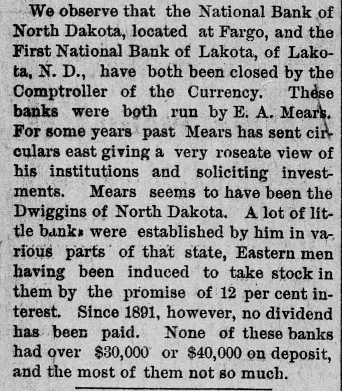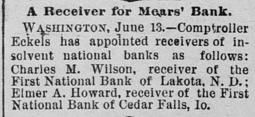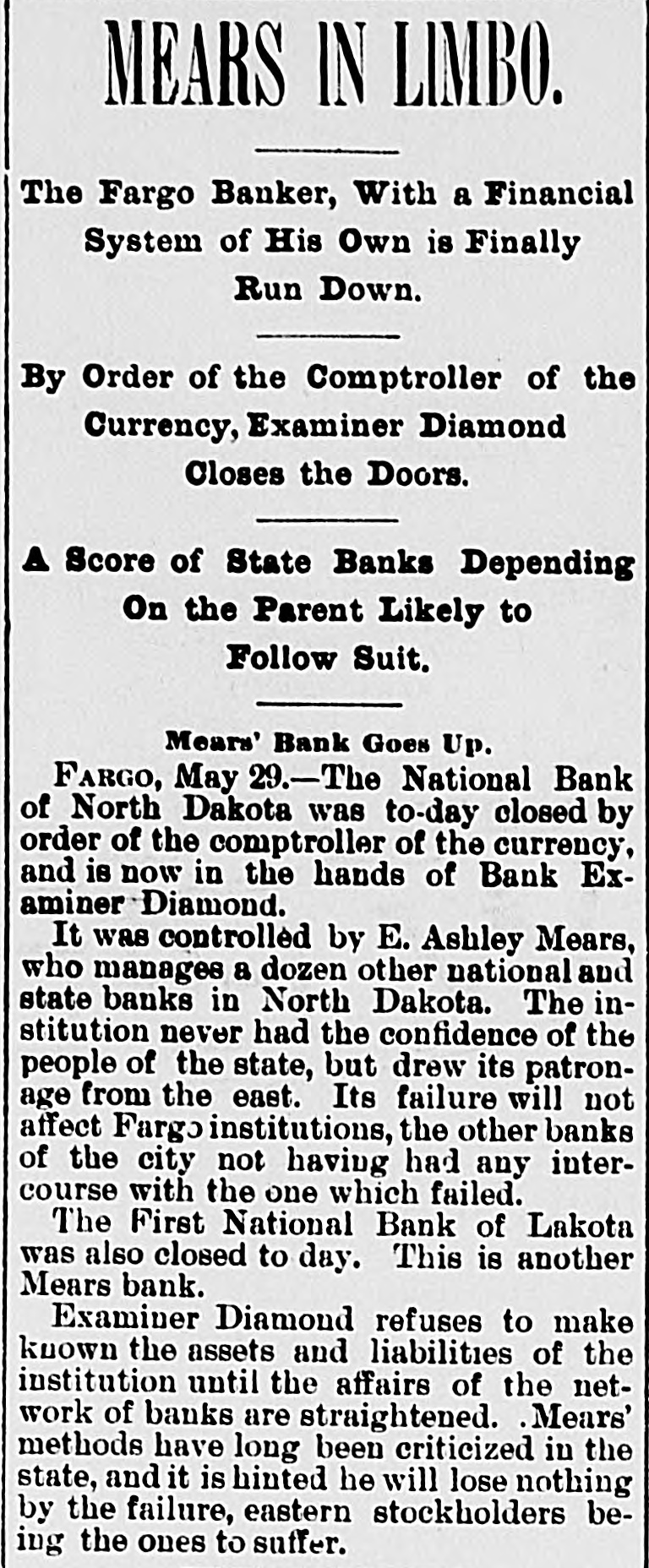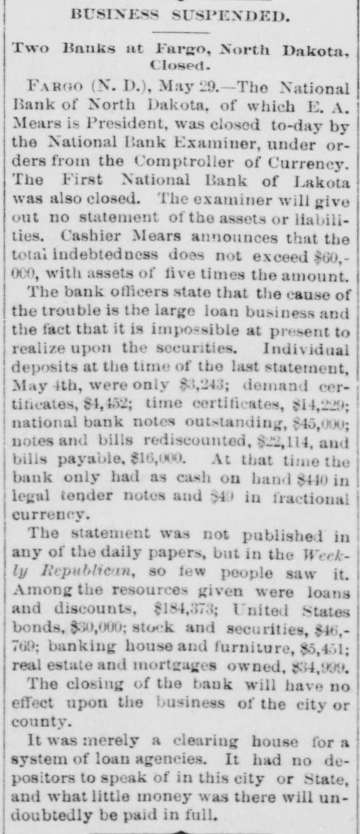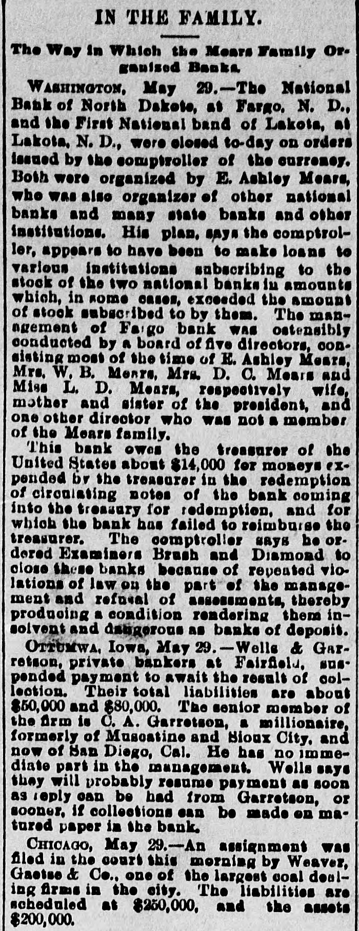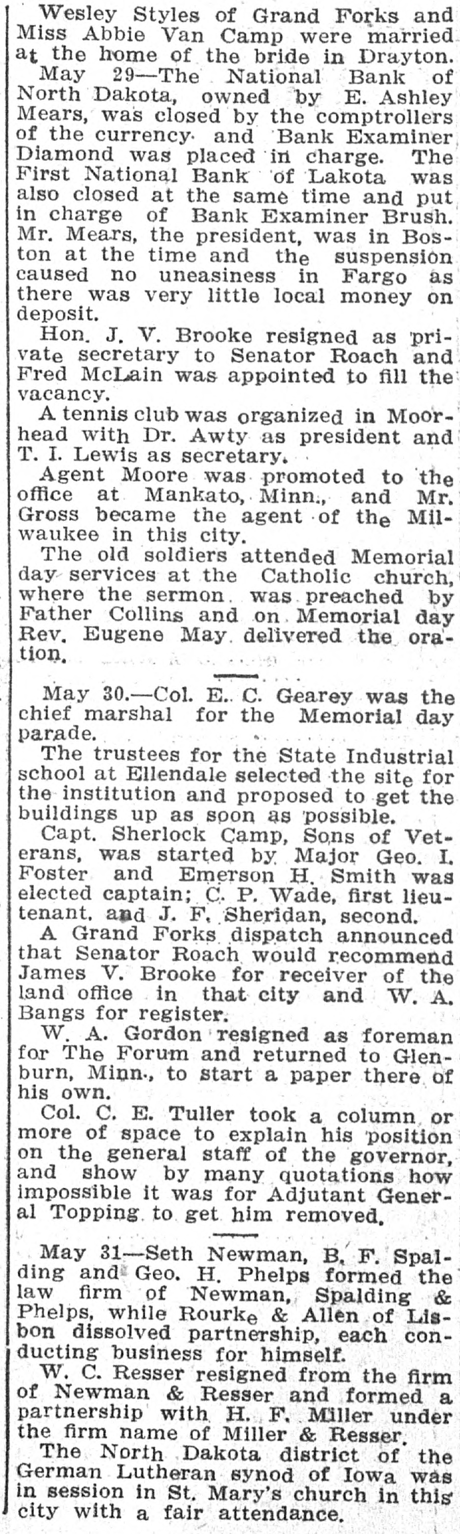 GENERAL NEWS NOTES. Items of Interest Gathered From Various Quarters. s Lewis Abbott, aged 17, shot himself at Atlanta, Ga., because his father told him to quit thinking about the girls. S. M. Wheeler, proprietor of a hotel y at Orrville, is missing. Commissioner Massey, of Delaware, has resigned from the World's Fair 1 Board because the gates were voted open on Sunday. t Two coal operators at Lancaster have brought suit against the Hocking Valley Railroad because the latter cars to their furnish the former ship would not coal. Carnet, Kas., was struck by a tornado on Thursday. The United Presbyterian General Assembly is in session at Monmouth, Ill. The North Baltimore Furniture Co. has gone to the wall for $50,000. Adam Kapple was killed at Mummaville by being jerked off his feet by a cow which he was leading, and falling so as to break his neck. Believing his wife to be unfaithful, John Simison, proprietor of the hotel at New Waterford, Columbiana county, swallowed two ounces of laudanum and will hardly recover. Misses Ethel May Sellers and Carrie Logan, both of respectable parents, are mysteriously missing from their homes at Lebanon, and their friends are much concerned over their absence. Daniel Wynohan, publisher of the Toledo Public Record, was thrown in front a car a barof moving electric by tender named Charles Strohmeir and almost killed, the result of asaloon row. Ex-Governor Foster has assigned for the benefit of creditors. Liabilities $800,000; assets much less. years has as a one Fred lived Matthews, hermit, who allowing for thirty no to enter his hut, died near Ashland. An injunction to restrain the World's Fair managers from opening the gates on Sunday, has been asked for. Hoke Smith has issued an order in regard to pensions requiring the disability, not of service origin, to be such as to prevent the applicant from earning a support by manual labor. At Roanke, Ind., Christian Haberkers killed his wife because she was a Catholic, set fire to his house and then killed himself. A colony of Mohammedans are arranging to Bettle in Georgia. F. H. Milburn, a son of the blind chaplain of the U.S. Senate, committed suicide at the Saratoga Hotel, Chicago. The World's Fair was opened on Sunday. About 173,000 people attended. Cholera has again made it appearance in Hamburg. Frederick Berry, an orphan boy at Lima, committed suicide because he was sick. A number of gate keepers at the World's Fair have been discharged for withholding tickets. The Comptroller of the Currency has ordered closed the First National Bank at Fargo, N. D., and the First National Bank at Lakota, N. D. John Hoy butchered his wife and two children at New Haven, Pa., and ended up by cutting his own throat. Foster may be able to effect a settlement with the creditors of Foster & Co. so that the bank can resume. The New York Central is running a train from New York to Chicago in 20 hours. Main's show was wrecked near Tyrone, Pa., and five people were killed and ten injured on Tuesday morning. The train bearing the remains of Jeff Davis reached Richmond Tuesday night. President Cleveland has gone to Hog Island to fish. He left Washington on Decoration Day. The Montana silver statue at the Fair was unvailed Tuesday. Mrs. James G. Blaine, Jr., has married her physician, Dr. Bull.