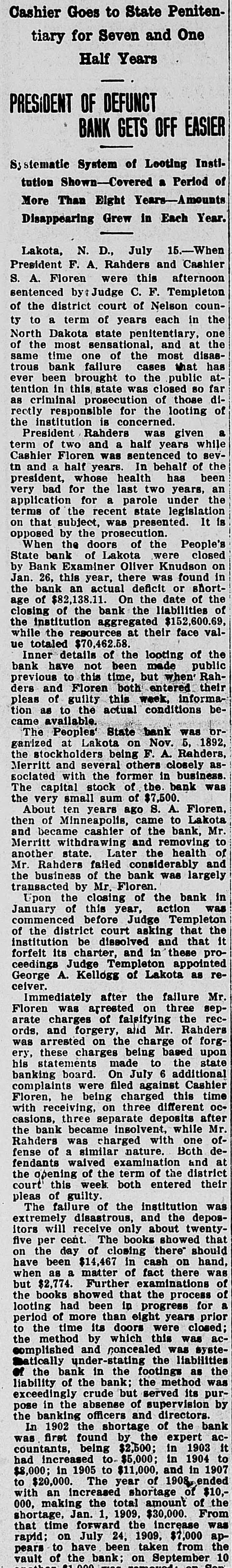 to Goes State Penitenfor One and tiary Seven Half Years OF GETS Instiof Period Each Year. July Cashier this C. Templeton of counNelson of in the each one Dakota of the most disas has that trous cases atpublic so far of dithose of rectly looting the given of two while to sevFloren Cashier In of the half years been whose president an for bad years, the of terms It on by of the When People's State bank by on Bank 26, in Jan this the short of of age the of of the valwhile face of the looting bank been have public but this Rahtheir ders and of this guilty beor was 1892, NOV Rahders, as closely in business. was The bank the Floren, then Lakota Mr. and bank, to of state and failed of the bank largely in the bank Upon of was this Judge of the that it and that these proappointed as of reGeorge Mr failure septhree the recand Mr. Rahders of forgupon being based state On the filed Cashier this time being ocMr the depwhile of one deBoth fense at and the district their court entered of pleas was The the depositors twentyfive that on the day should on been hand, have was when there of but $2,774 of the in for prior to was the as of the the was its purthe by and the the In 1902 bank acfirst found it 1903 being to 1904 had in 1907 $8,000; to ended 190% of $10, with of the 000, From 1909, was the $30,000.00 time that on ap 1909, $7,000 rapid; to the from been on 10 September