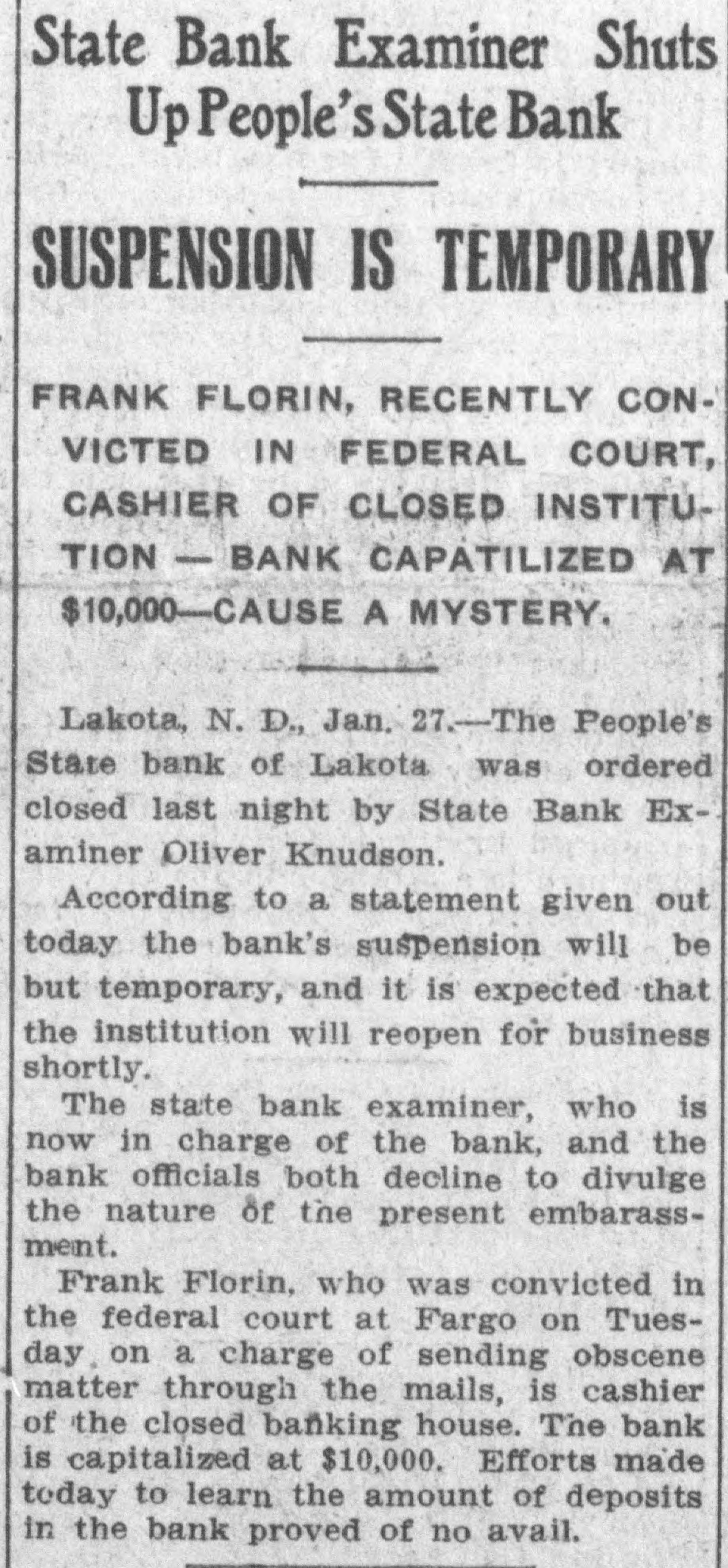 State Bank Examiner Shuts Up People's State Bank SUSPENSION IS TEMPORARY FRANK FLORIN, RECENTLY CONVICTED IN FEDERAL COURT, CASHIER OF CLOSED INSTITUTION - BANK CAPATILIZED AT $10,000-CAUSE A MYSTERY. Lakota, N. D., Jan. 27.-The People's State bank of Lakota was ordered closed last night by State Bank Examiner Oliver Knudson. According to a statement given out today the bank's suspension will be but temporary, and it is expected that the institution will reopen for business shortly. The state bank examiner, who is now in charge of the bank, and the bank officials both decline to divulge the nature of the present embarassment. Frank Florin, who was convicted in the federal court at Fargo on Tuesday on a charge of sending obscene matter through the mails, is cashier of the closed banking house. The bank is capitalized at $10,000. Efforts made today to learn the amount of deposits in the bank proved of no avail.