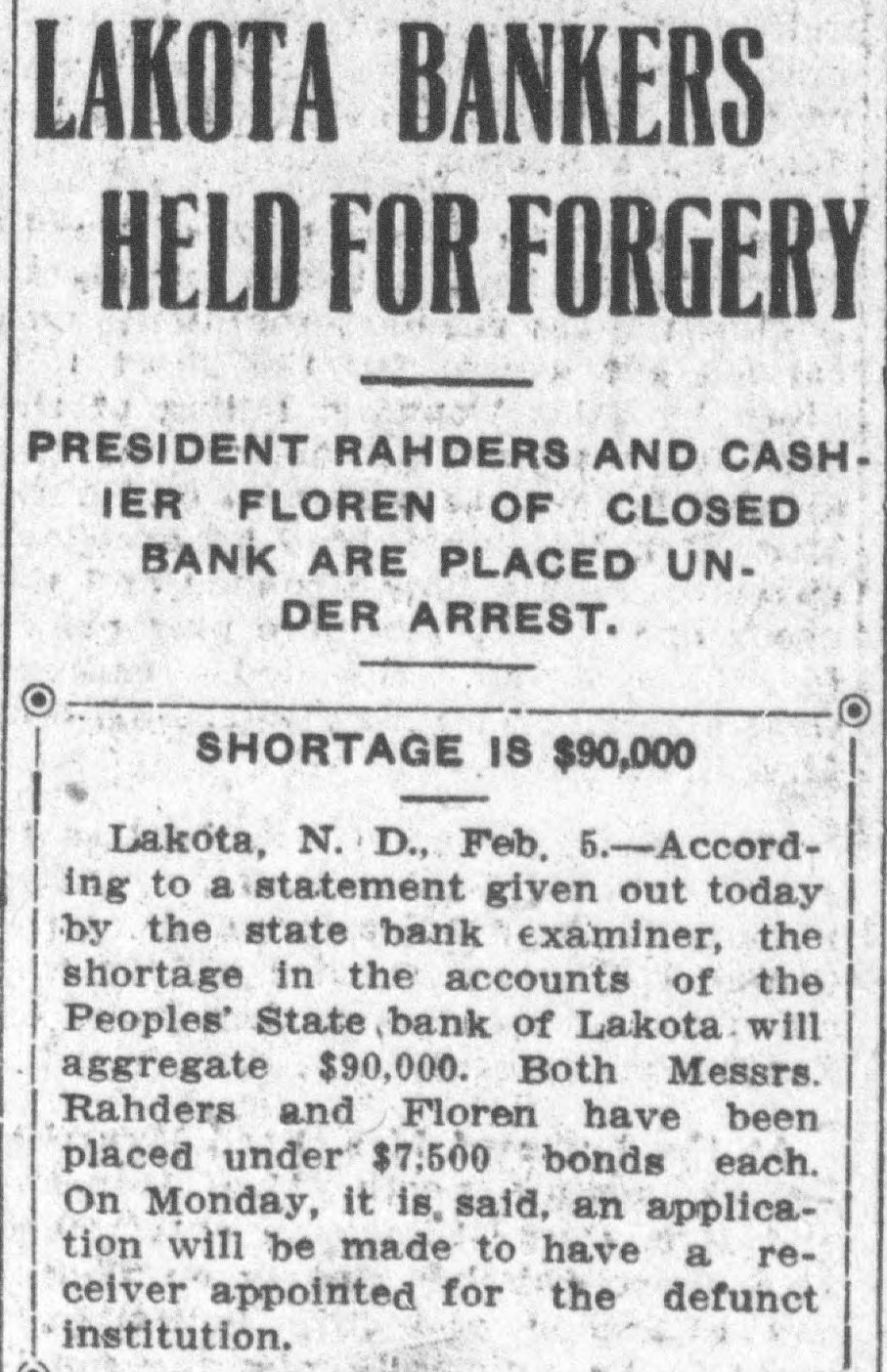 Lakota, N. D., Feb: 5.-The sensation that has been expected in connection with the closing of the People's State bank of this city a couple of weeks ago by State Bank Examiner Oliver Knudson, was forthcoming yesterday when F. A. Rahders, the president of the bank, was arrested on a charge of forgery. He waived preliminary hearing and was bound over to the next term of the district court under $3,500 bail, which was furnished. S. A. Floren, the cashier of the bank, will be arrested today on a similar charge and undoubtedly the same commse of procedure will be gone through with, as in the case against Rahders. The amourt of the deficit is $3,500 and both men have turned their property over to the receivers of the bank to make restitution. The offense is that of subscribing to a false statemert which was issued Nov. 16, and under the North Dakota statute this becomes a forgery. Owing to the prominence of the men arrested, the case is attracting considerable interest all over this section of the state.