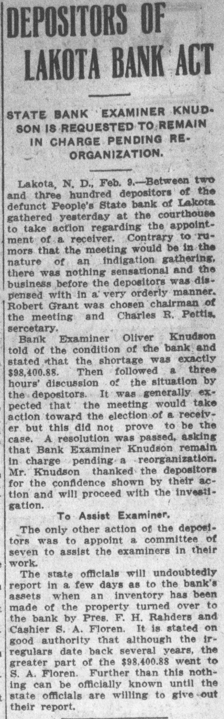 DEPOSITORS OF LAKOTA BANK ACT STATE BANK examiner KNUDSON IS REQUESTED TO REMAIN IN CHARGE PENDING REORGANIZATION. Lakota, N. D., Feb. 9.-Between two and three hundred depositors of the defunct People's State bank of Lakota gathered yesterday at the courthouse to take action regarding the appointment of a. receiver. Contrary to rumors that the meeting would be in the nature of an indigation gathering, there was nothing sensational and the business before the depositors was dispensed with in a very orderly manner. Robert Grant was chosen chairman of the meeting and Charles R. Pettis. sercetary. Bank Examiner Oliver Knudson told of the condition of the bank and stated that the shortage was exactly $98,400.88. Then followed a three hours' discussion of the situation by the depositors. It was generally expected that the meeting would take action toward the election of a receiver but this did not prove to be the case. A resolution was passed, asking that Bank Examiner Knudson remain in charge pending a reorganization. Mr. Knudson thanked the depositors for the confidence shown by their action and will proceed with the investigation. To Assist Examiner. The only other action of the depositors was to appoint a. committee of seven to assist the examiners in their work. The state officials will undoubtedly report in a few days as to the bank's assets when an inventory has been made of the property turned over to the bank by Pres. F. H. Rahders and Cashier S. A. Floren. It is stated on good authority that although the irregulars date back several years, the greater part of the $98,400.88 went to S. A. Floren. Further than this nothing can be officially known until the state officials are willing to give out their report.