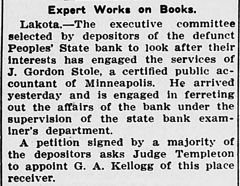 Expert Works on Books. Lakota.-The executive committee selected by depositors of the defunct Peoples' State bank to look after their interests has engaged the services of J. Gordon Stole, a certified public accountant of Minneapolis. He arrived yesterday and is engaged in ferreting out the affairs of the bank under the supervision of the state bank examIner's department. A petition signed by a majority of the depositors asks Judge Templeton to appoint G. A. Kellogg of this place receiver.
