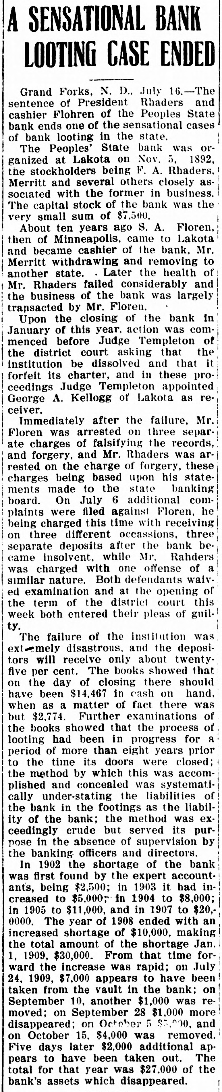 A SENSATIONAL BANK LOOTING CASE ENDED Grand Forks, N. D., July 16.-The sentence of President Rhaders and cashier Flohren of the Peoples State bank ends one of the sensational cases of bank looting in the state. The Peoples' State bank was organized at Lakota on Nov. 5, 1892, the stockholders being F. A. Rhaders. Merritt and several others closely associated with the former in business. The capital stock of the bank was the very small sum of $7,500. About ten years ago S. A. Floren, then of Minneapolis, came to Lakota and became cashier of the bank. Mr. Merritt withdrawing and removing to another state. Later the health of Mr. Rhaders failed considerably and the business of the bank was largely transacted by Mr. Floren. Upon the closing of the bank in January of this year. action was commenced before Judge Templeton of the district court asking that the institution be dissolved and that it forfeit its charter, and in these proceedings Judge Templeton appointed George A. Kellogg of Lakota as receiver. Immediately after the failure, Mr. Floren was arrested on three separate charges of falsifying the records, and forgery. and Mr. Rhaders was arrested on the charge of forgery, these charges being based upon his statements made to the state banking board. On July 6 additional complaints were filed against Floren, he being charged this time with receiving on three different occassions, three separate deposits after the bank became insolvent. while Mr. Rahders was charged with one offense of a similar nature. Both defendants waived examination and at the opening of the term of the district court this week both entered their pleas of guilty. The failure of the institution was ext-mely disastrous, and the depositors will receive only about twentyfive per cent. The books showed that on the day of closing there should have been $14,467 in cash on hand. when as a matter of fact there was but $2.774. Further examinations of the books showed that the process of looting had been in progress for a period of more than eight years prior to the time its doors were closed; the method by which this was accomplished and concealed was systematically under-stating the liabilities of the bank in the footings as the liability of the bank; the method was exceedingly crude but served its purpose in the absence of supervision by the banking officers and directors. In 1902 the shortage of the bank was first found by the expert accountants, being $2,500; in 1903 it had increased to $5,000; in 1904 to $8,000; in 1905 to $11,000, and in 1907 to $20,0000. The year of 1908 ended with an increased shortage of $10,000, making the total amount of the shortage Jan. 1, 1909, $30,000. From that time forward the increase was rapid; on July 24. 1909, $7,000 appears to have been taken from the vault in the bank; on September 10, another $1,000 was removed; on September 28 $1,000 more