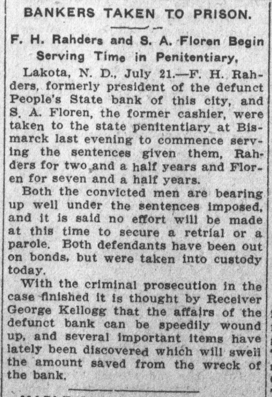 BANKERS TAKEN TO PRISON. F. H. Rahders and S. A. Floren Begin Serving Time in Penitentiary, Lakota, N. D., July 21.-F. H. Rahders, formerly president of the defunct People's State bank of this city, and S. A. Floren, the former cashier, were taken to the state penitentiary at Bismarck last evening to commence serving the sentences given them, Rahders for two and a half years and Floren for seven and a half years. Both the convicted men are bearing up well under the sentences imposed, and it is said no effort will be made at this time to secure a retrial or a parole. Both defendants have been out on bonds, but were taken into custody today. With the criminal prosecution in the case finished it is thought by Receiver George Kellogg that the affairs of the defunct bank can be speedily wound up, and several important items have lately been discovered which will swell the amount saved from the wreck of the bank.