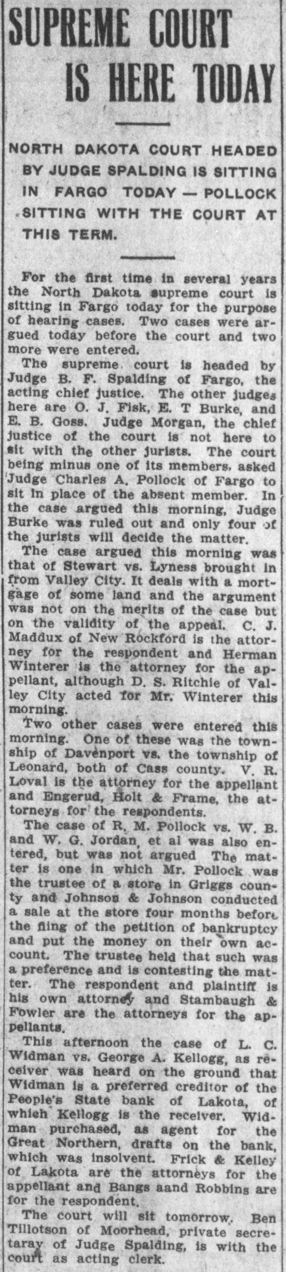 The case argued this morning was that of Stewart vs. Lyness brought in from Valley City. It deals with a mortgage of some land and the argument was not on the merits of the case but on the validity of the appeal. C. J. Maddux of New Rockford is the attorney for the respondent and Herman Winterer is the attorney for the appellant, although D. S. Ritchie of Valley City acted for Mr. Winterer this morning.