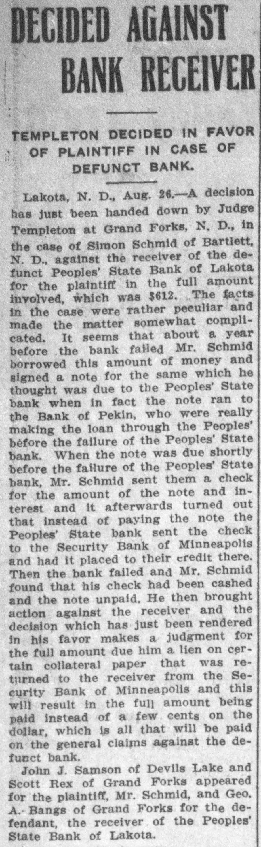 DECIDED AGAINST BANK RECEIVER TEMPLETON DECIDED IN FAVOR OF PLAINTIFF IN CASE OF DEFUNCT BANK. Lakota, N. D., Aug. 26.-A decision has just been handed down by Judge Templeton at Grand Forks, N. D., in the case of Simon Schmid of Bartlett, N. D., against the receiver of the defunct Peoples' State Bank of Lakota for the plaintiff in the full amount involved, which was $612. The facts in the case were rather peeuliar and made the matter somewhat complicated. It seems that about a year before the bank failed Mr. Schmid borrowed this amount of money and signed a note for the same which he thought was due to the Peoples' State bank when in fact the note ran to the Bank of Pekin, who were really making the loan through the Peoples' béfore the failure of the Peoples' State bank. When the note was due shortly before the failure of the Peoples' State bank, Mr. Schmid sent them a check for the amount of the note and interest and it afterwards turned out that instead of paying the note the Peoples' State bank sent the check to the Security Bank of Minneapolis and had it placed to their credit there. Then the bank failed and Mr. Schmid found that his check had been cashed and the note unpaid. He then brought action against the receiver and the decision which has just been rendered in his favor makes a judgment for the full amount due him a lien on certain collateral paper that was returned to the receiver from the Security Bank of Minneapolis and this will result in the full amount being paid instead of a few cents on the dollar, which is all that will be paid on the general claims against the defunct bank. John J. Samson of Devils Lake and Scott Rex of Grand Forks appeared for the plaintiff, Mr. Schmid, and Geo. A.- Bangs of Grand Forks for the defendant, the receiver of the Peoples' State Bank of Lakota.