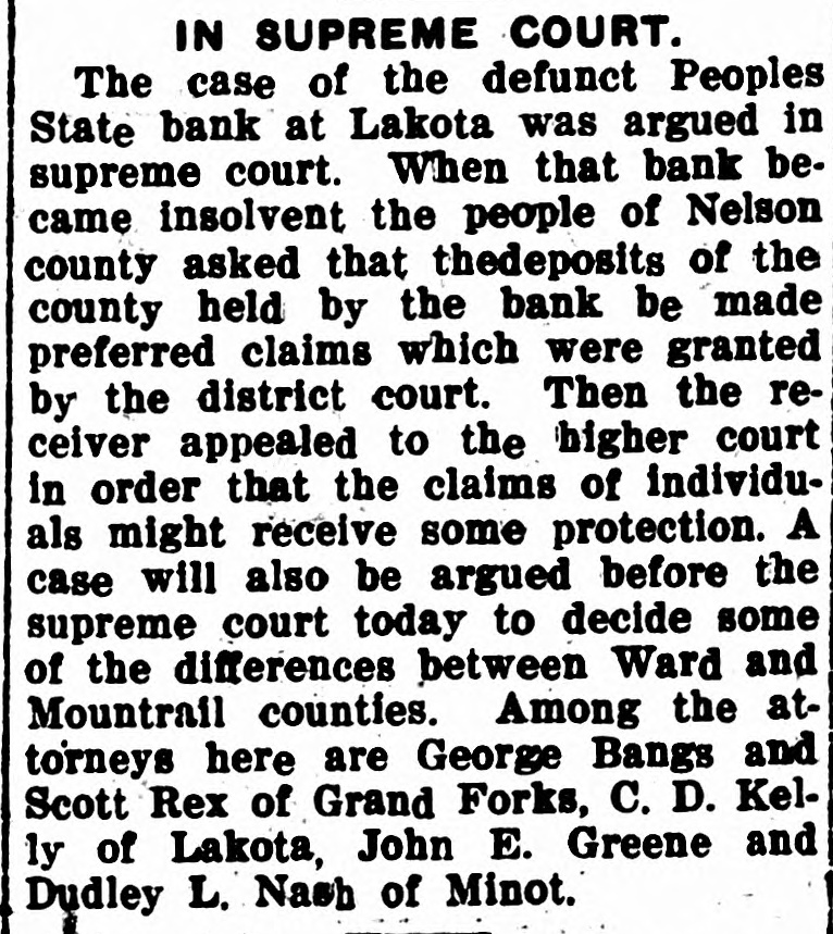 The case of the defunct People's State bank at Lakota was argued in supreme court. When that bank became insolvent the people of Nelson county asked that the deposits of the county held by the bank be made preferred claims which were granted by the district court. Then the receiver appealed to the higher court in order that the claims of individuals might receive some protection. A case will also be argued before the supreme court today to decide some of the differences between Ward and Mountrail counties. Among the attorneys here are George Bangs and Scott Rex of Grand Forks, C. D. Kelly of Lakota, John E. Greene and Dudley L. Nash of Minot.