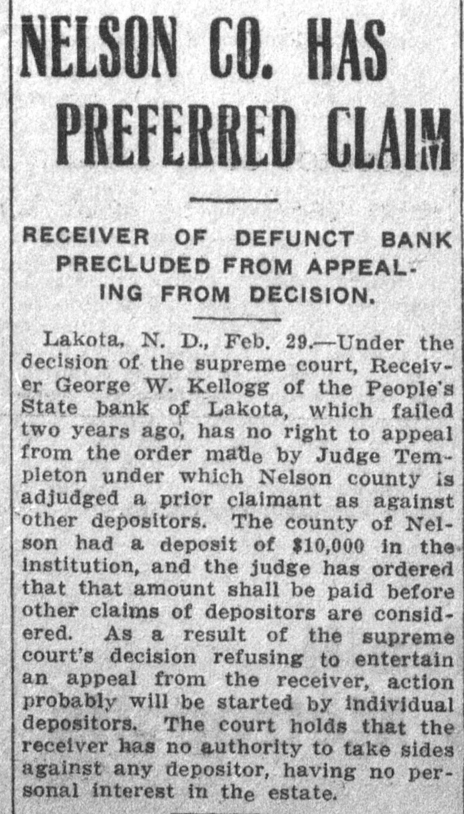 NELSON CO. HAS PREFERRED CLAIM RECEIVER OF DEFUNCT BANK PRECLUDED FROM APPEALING FROM DECISION. Lakota, N. D., Feb. 29.-Under the decision of the supreme court, Receiver George W. Kellogg of the People's State bank of Lakota, which failed two years ago, has no right to appeal from the order made by Judge Templeton under which Nelson county is adjudged a prior claimant as against other depositors. The county of Nelson had a deposit of $10,000 in the institution, and the judge has ordered that that amount shall be paid before other claims of depositors are considered. As a result of the supreme court's decision refusing to entertain an appeal from the receiver, action probably will be started by individual depositors. The court holds that the receiver has no authority to take sides against any depositor, having no personal interest in the estate.