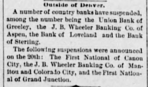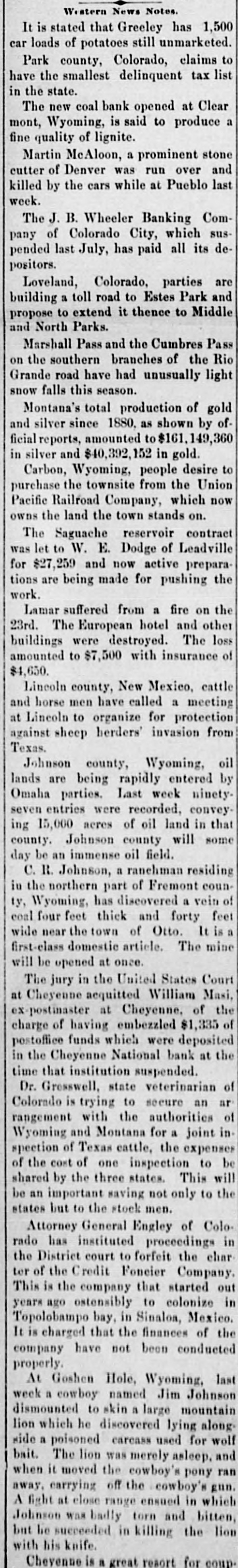 Western News Notes. It is stated that Greeley has 1,500 car loads of potatoes still unmarketed. Park county, Colorado, claims to have the smallest delinquent tax list in the state. The new coal bank opened at Clear mont, Wyoming, is said to produce a fine quality of lignite. Martin McAloon, a prominent stone cutter of Denver was run over and killed by the cars while at Pueblo last week. The J. B. Wheeler Banking Company of Colorado City, which suspended last July, has paid all its depositors. Loveland, Colorado, parties are building a toll road to Estes Park and propose to extend it thenee to Middle and North Parks. Marshall Pass and the Cumbres Pass on the southern branches of the Rio Grande road have had unusually light snow falls this season. Montana's total production of gold and silver since 1880, as shown by official reports, amounted to $161,149,360 in silver and $40,392,152 in gold. Carbon, Wyoming, people desire to purchase the townsite from the Union Pacific Railroad Company, which now owns the land the town stands on. The Saguache reservoir contract was let to W. E. Dodge of Leadville for $27,259 and now active preparations are being made for pushing the work. Lamar suffered from a fire on the 23rd. The European hotel and other buildings were destroyed. The loss amounted to $7,500 with insurance of $4,650. Lincoln county, New Mexico, cattle and horse men have called a meeting at Lineoln to organize for protection against sheep herders' invasion from Texas. Johnson county, Wyoming, oil lands are being rapidly entered by Omaha parties. Last week ninetyseven entries were recorded, conveying 15,000 acres of oil land in that county. Johnson county will some day be an immense oil field. C. R. Johnson, a ranehman residing in the northern part of Fremont county, Wyoming, has discovered a vein of coal four feet thick and forty feet wide near the town of Otto. It is a first-class domestic article. The mine will be opened at once. The jury in the United States Court at Cheyenne acquitted William Masi, ex-postinaster at Cheyenne, of the charge of having embezzled $1,335 of postoffice funds which were deposited in the Cheyenne National bank at the